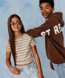 Ce joli tee-shirt rayé à manches courtes accompagnera les ados au quotidien, s’intégrant aussi bien dans des looks décontractés que dans des tenues élégantes. Un tee-shirt fille en coton côtelé, extensible et confortable, doté d’un col rond en bord-côte. Une pièce facile à vivre à classer parmi les essentiels du vestiaire !