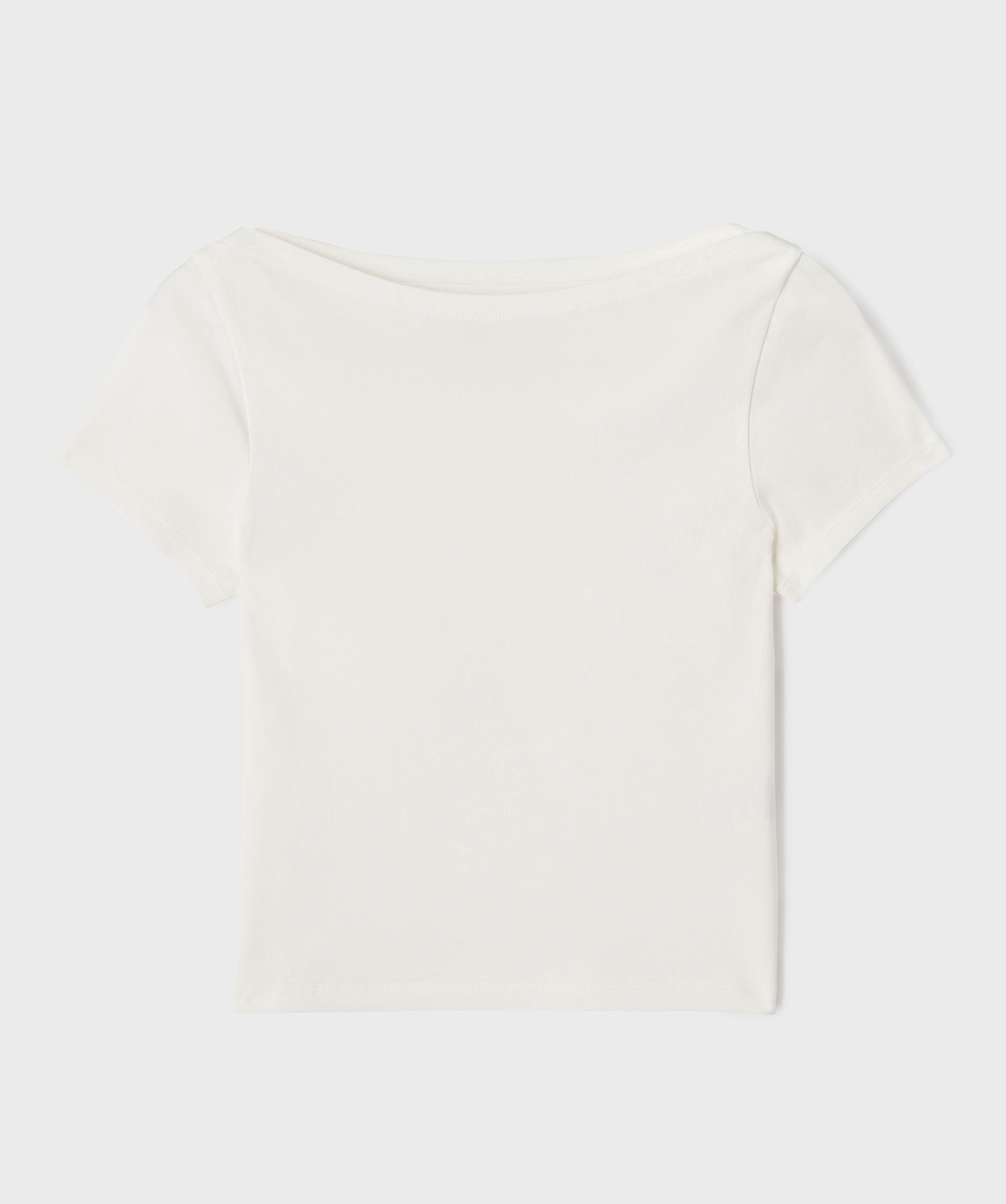 Ce joli tee-shirt à manches courtes permettra de sublimer le décolleté grâce à son élégant col bateau qui s’étend jusqu’à la pointe des épaules. Sa coupe courte ajoute une note tendance à toutes les tenues de l’été. Un tee-shirt fille plein de charme confectionné en coton stretch pour un maximum de confort. Il se porte avec un jean large et des baskets pour ajouter une touche glamour à un look streetwear, ou avec une jupe pour une allure plus sophistiquée.