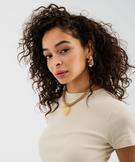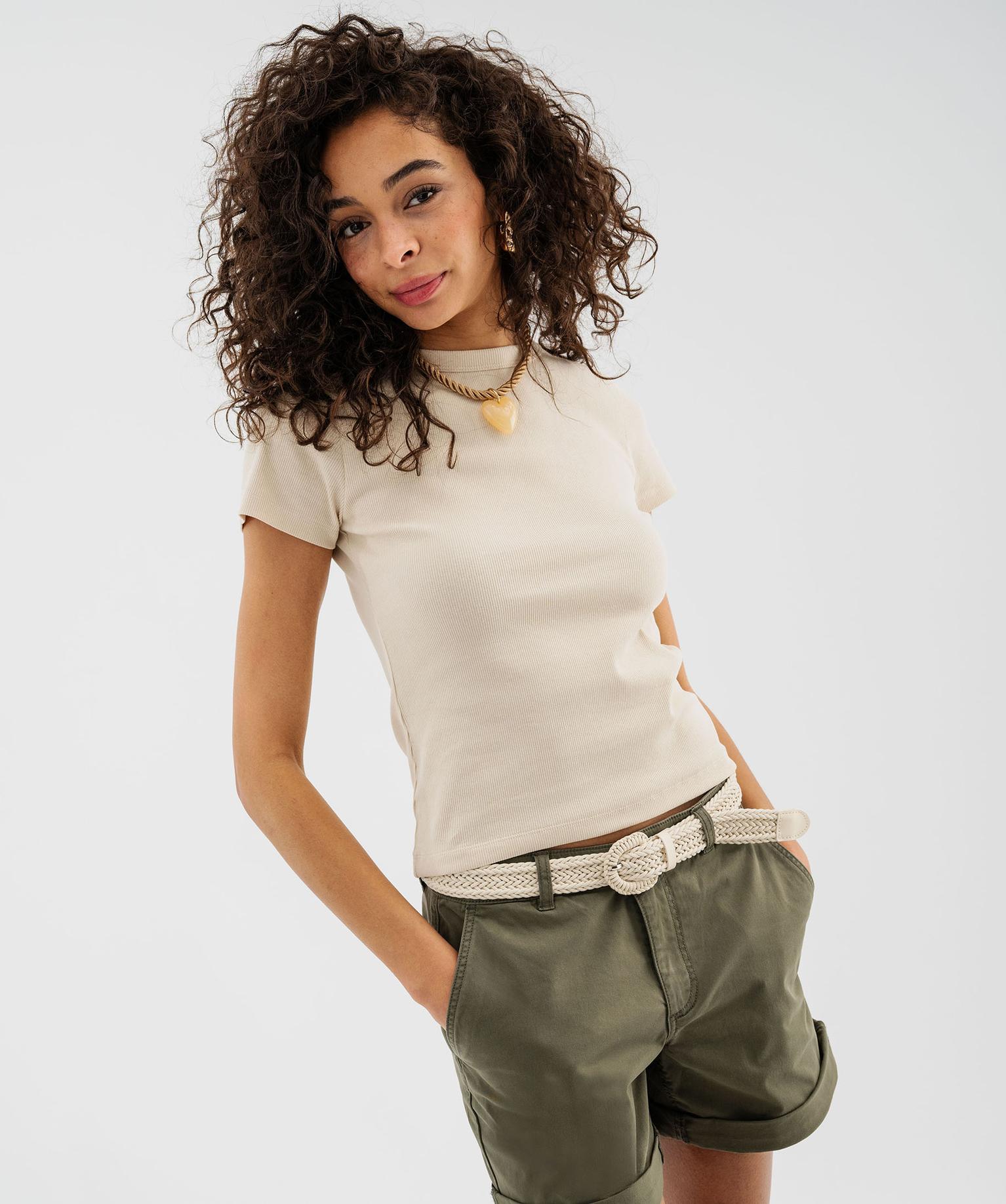 Tee-shirt manches courtes et col rond en maille côtelée femme beige clair