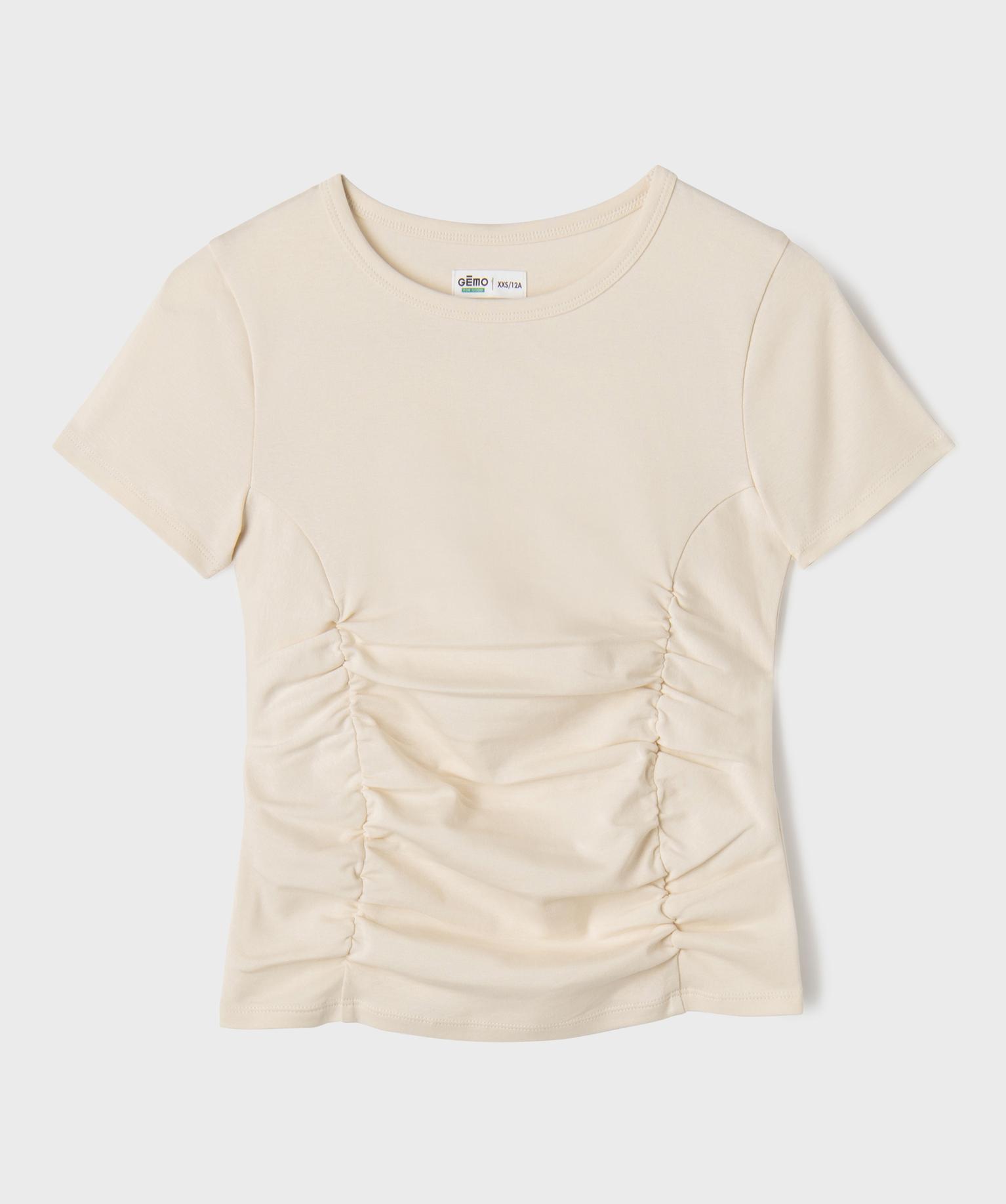 Ce tee-shirt fille à manches courtes en jersey de coton propose une alternative originale aux basiques classiques. Il présente 2 coutures élastiquées sur le devant qui créent un jeu de fronces élégant. Ce détail malin donne un effet ajusté et girly au tee-shirt sans compromettre son confort. Le tissu stretch épouse naturellement la silhouette tout en restant agréable à porter. Une pièce à la fois simple et sophistiquée, idéale pour apporter une touche d’originalité à une tenue du quotidien. Encolure ronde finition biais ton sur ton.