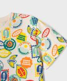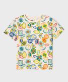 Ce tee-shirt manches courtes orné de motifs estivaux d'inspiration rétro devant et dos va vite faire partie des pièces fortes du dressing des enfants. Un tee-shirt à manches courtes garçon facile à combiner avec un bermuda en jean, un short en coton ou à porter avec le bermuda intégré pour un total look très joyeux et cool. Col rond en bord-côte uni.