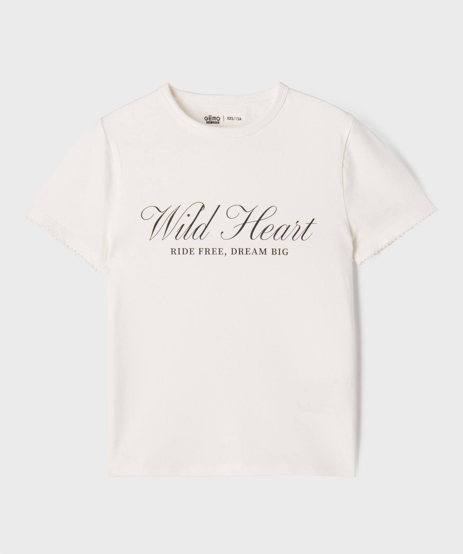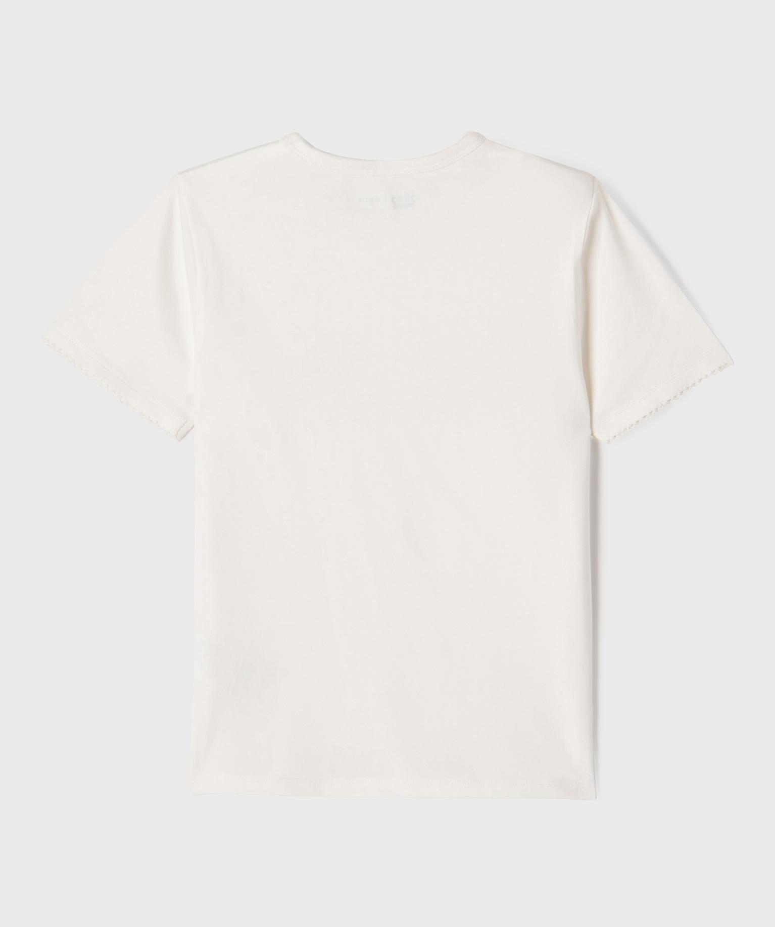 Ce tee-shirt fille en jersey de coton stretch propose une coupe droite, légèrement près du corps, qui reste confortable grâce à sa matière extensible. Il se distingue par ses manches courtes délicatement finies d’une dentelle. Une inscription sur la poitrine apporte tendance et modernité. Agréable à porter et facile à associer, ce tee-shirt manches courtes est idéal pour un usage quotidien, avec un jean flare ou une jupe trapèze.