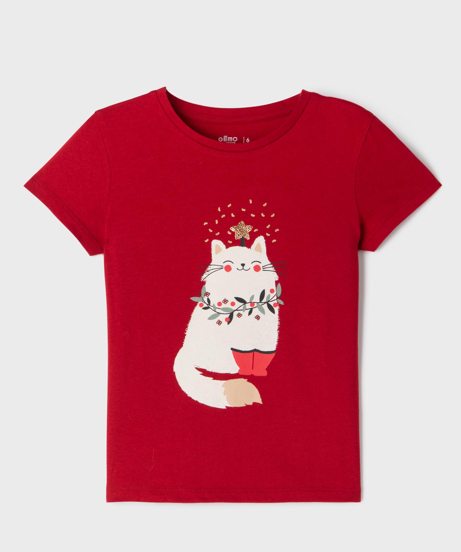 Tee-shirt manches courtes imprimé spécial Noël fille rouge