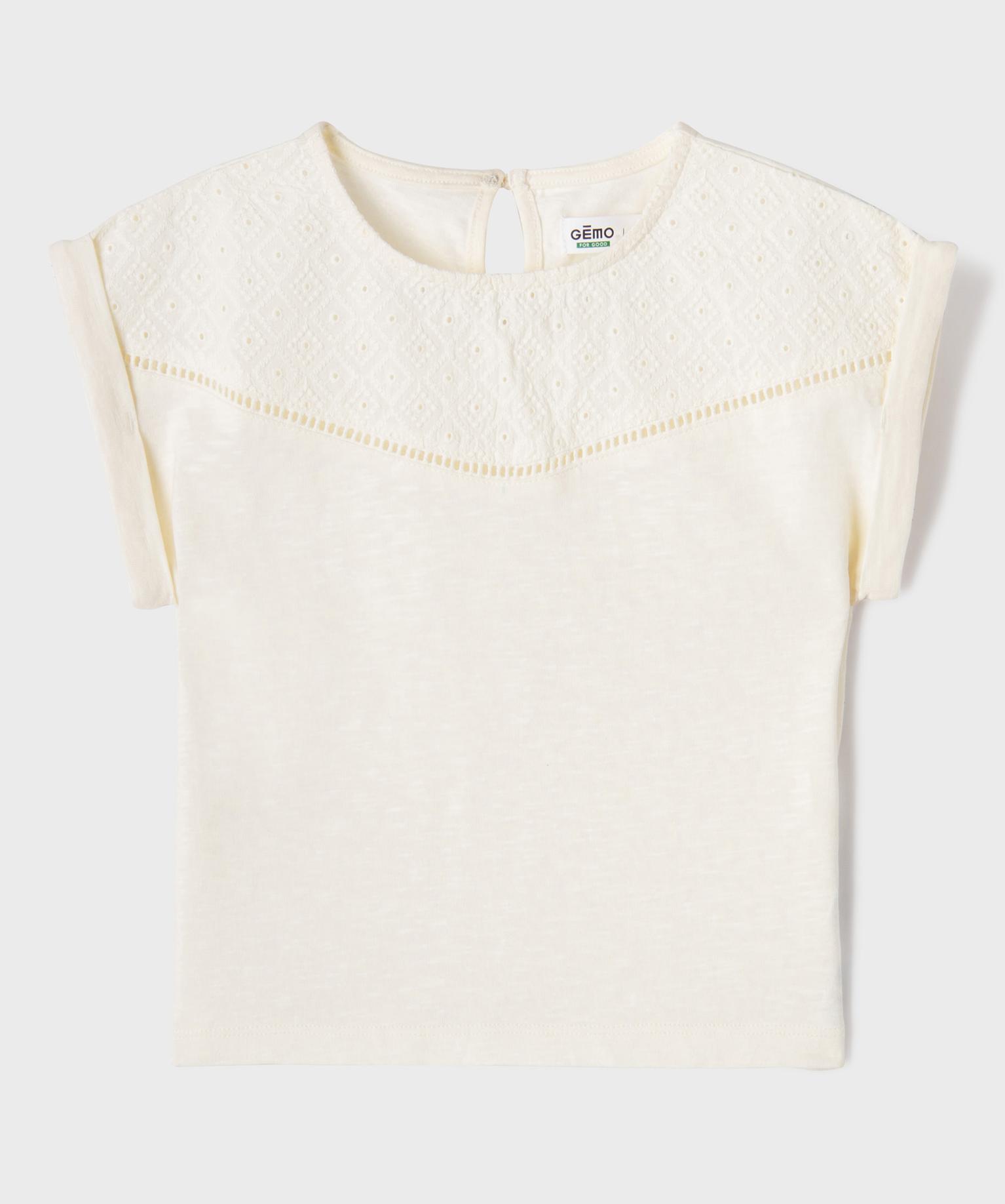 Ce tee-shirt apporte une touche bohème irrésistible à la garde-robe de votre fille tout en restant facile à porter au quotidien. Sa coupe loose et ses manches courtes à revers offrent un tombé décontracté. Sur l’avant, un plastron brodé et ajouré ton sur ton sublime l’ensemble et lui donne un charme délicat. Le col rond est accompagné au dos d’une ouverture boutonnée avec petite fente, pratique à enfiler. Le tee-shirt fille est fabriqué dans un jersey de coton flammé. Il se mixe à merveille avec un short en jean ou une jupe fluide.