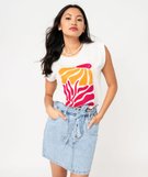 Ambiance estivale garantie avec ce tee-shirt femme ! Un tee-shirt aux manches courtes tombantes retournées et cousues sur l'intérieur pour laisser vos bras à l'air et accentuer son côté loose. Le tee-shirt ample est décoré sur l'avant d'un grand motif d'inspiration florale et hippie souligné de perles ou de paillettes selon le modèle. Les couleurs chatoyantes égayeront votre short en jean fétiche comme votre jupe en toile ! Col rond en bord-côte. Dos uni.