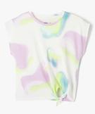 Effet tie-and-dye en pastel et fluo, coupe loose nouée sur le côté pour un look girly et décontracté, ce tee-shirt fille est au top des tendances. Le tee-shirt à manches courtes sera mis en valeur par un short en jean et des tennis en toile à semelle plateforme.