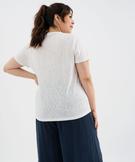 Ajoutez une touche de lumière dans vos tenues quotidiennes avec ce superbe tee-shirt pailleté ! Un tee-shirt pour femme grande taille (du 46/48 au 54/56) en maille fluide légèrement transparente, incrustée de fil métallisé, avec un col V souligné d'un tressage original. Le tee-shirt à manches courtes trouvera aussi bien sa place dans un look casual avec un jean et des baskets que dans un look plus travaillé, avec une jupe crayon et des escarpins.