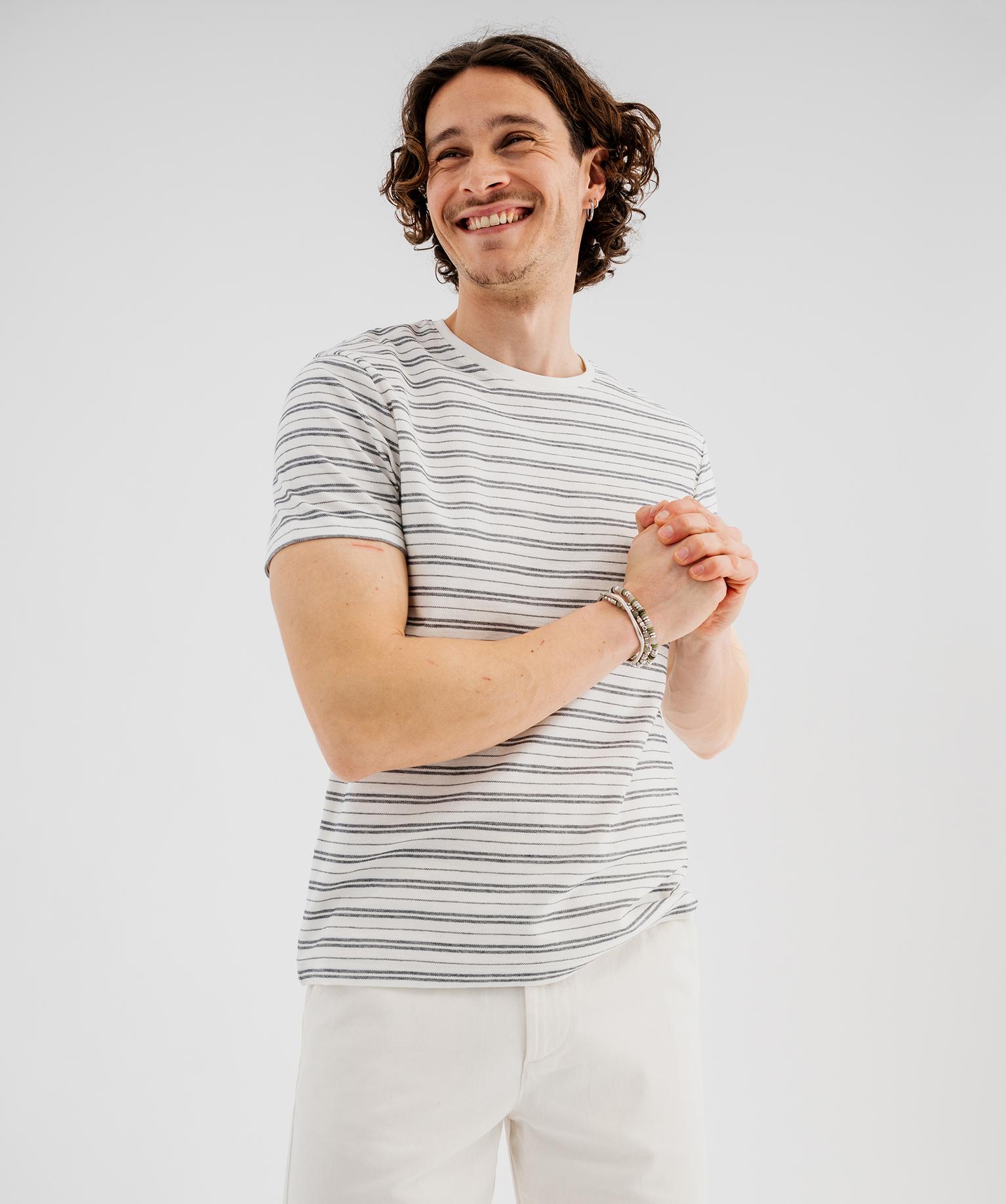 Une brise marine souffle sur le vestiaire masculin avec ce joli tee-shirt à manches courtes rayé. Un modèle chic et intemporel confectionné en coton piqué, offrant un tombé impeccable. Il est doté d’un col rond souligné par un biais et s’adapte à toutes les envies, s’associant aussi bien avec un pantalon chino, qu’avec un jean ou un bermuda en lin. Un tee-shirt homme à la conception plus responsable, contenant du coton recyclé.