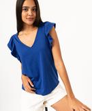 Tee-shirt manches courtes volantés à paillettes femme bleu