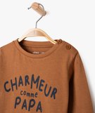 Une info à faire passer ou un cadeau de naissance rigolo à faire ? Pensez au tee-shirt bébé garçon à message ! Un tee-shirt manches longues stylé, décliné dans des couleurs naturelles pleines de charme avec différentes inscriptions fantaisie. Le tee-shirt est fabriqué dans un jersey 100% coton avec 2 boutons sur l'épaule pour élargir l'encolure et faciliter le passage de la tête. Col rond côtelé. Dos uni. Coupe droite.