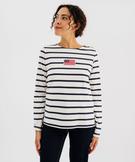 LuluCastagnette revisite la marinière : retrouvez l'incontournable tee-shirt à rayures en version manches longues paré d'un drapeau brodé sur la poitrine. Le tee-shirt femme est fabriqué en jersey de coton épais : il ravira les frileuses, et pourra se porter au guise de pull extra léger à la mi-saison. On adore l'épaule boutonnée avec ses gros boutons en métal doré gravés ! Encolure bateau dégagée.