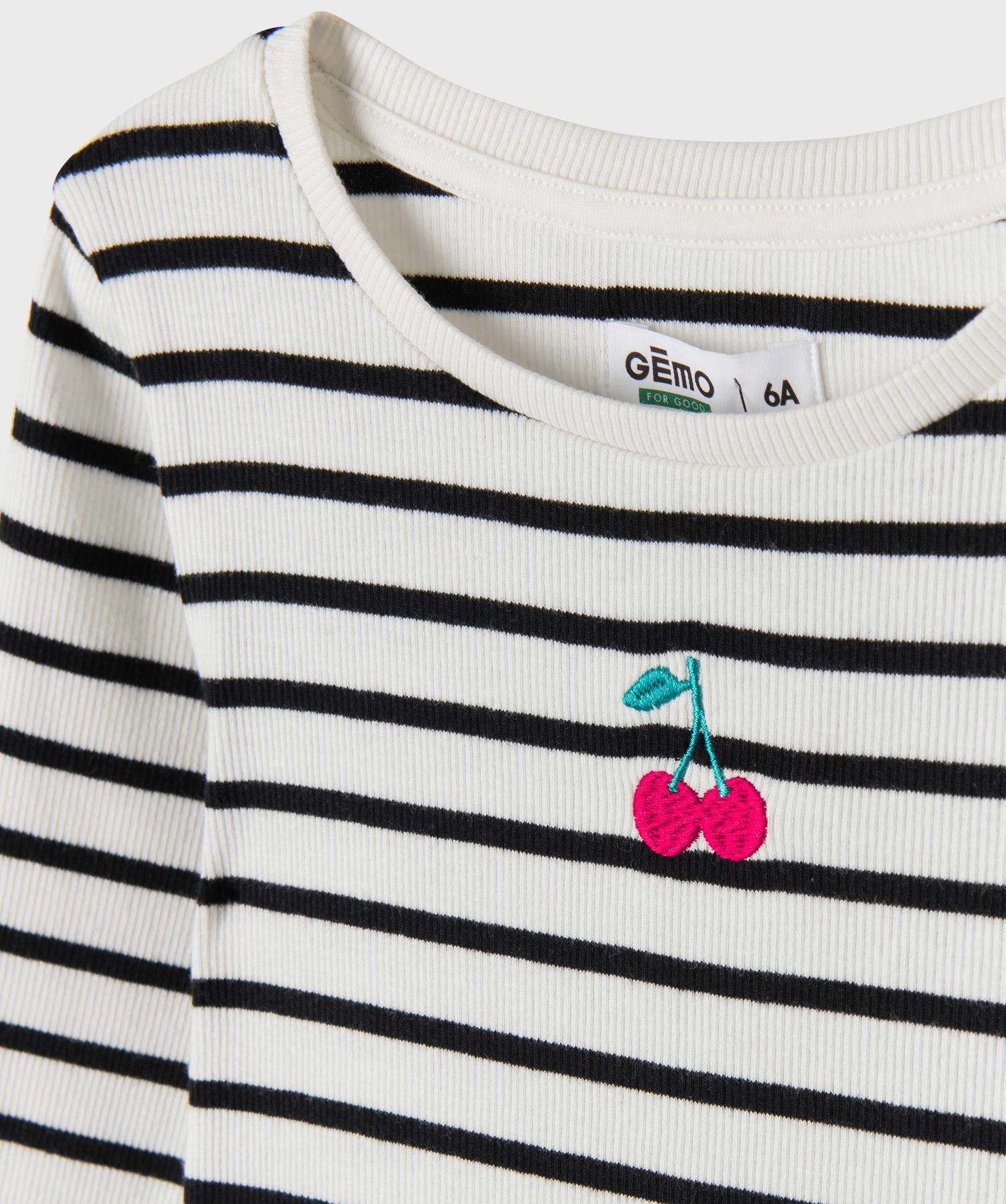L’esprit marinière se réinvente en version girly avec ce tee-shirt rayée en maille côtelée. Sa coupe droite à manches longues est mise en valeur par des finitions roulottées aux poignets et dans le bas. Le petit motif cerises brodé sur le buste apporte une touche fraîche et pétillante. Le col rond en bord-côte et la matière en jersey de coton stretch assurent confort et liberté de mouvement à votre fillette. Ce tee-shirt fille sera irrésistible avec une jupe en jean ou sous une salopette pour un look rétro adorable.