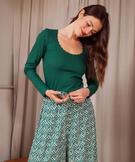 Tee-shirt manches longues avec col rond en dentelle femme vert