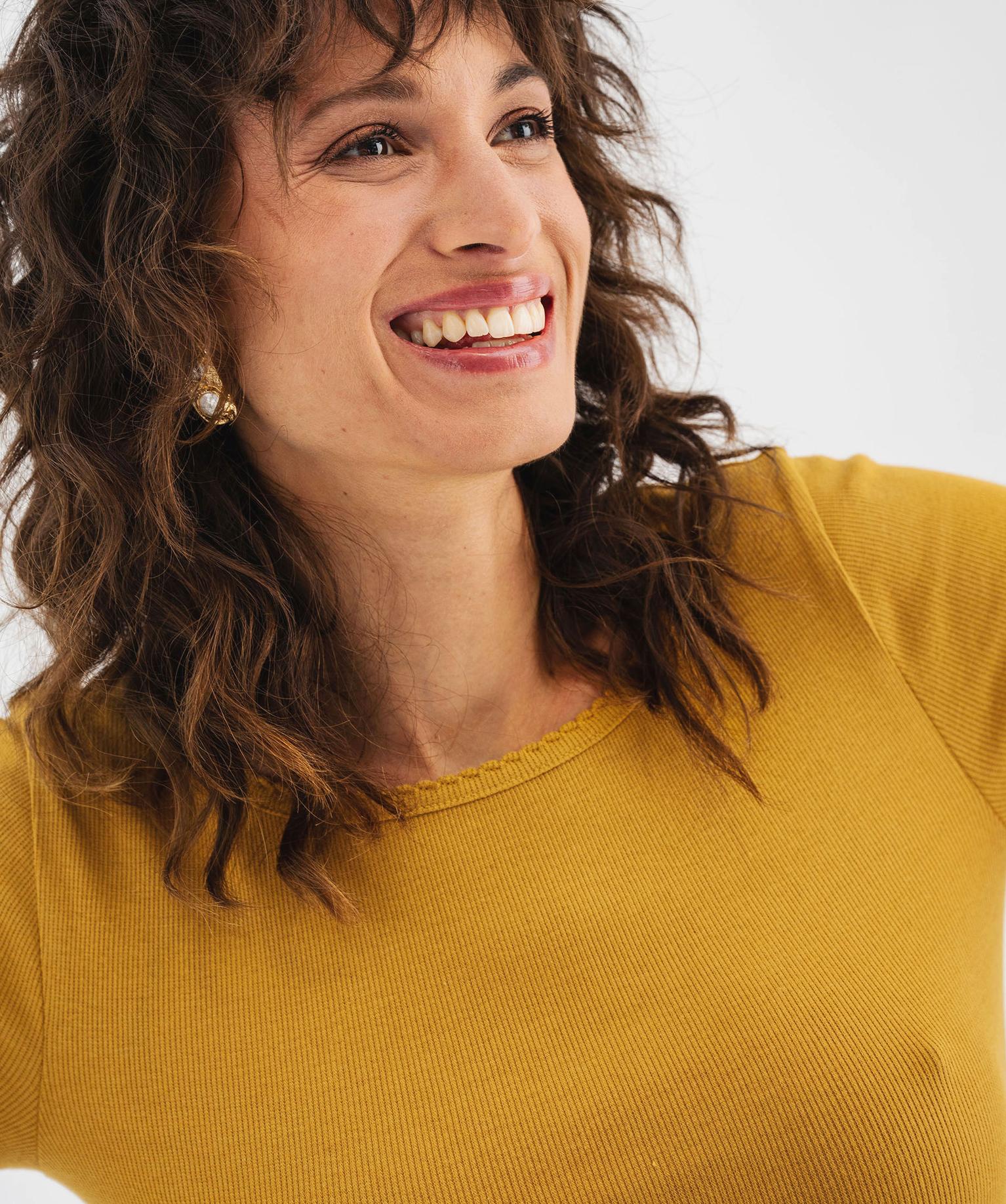 Tee-shirt manches longues en maille côtelée extensible femme jaune