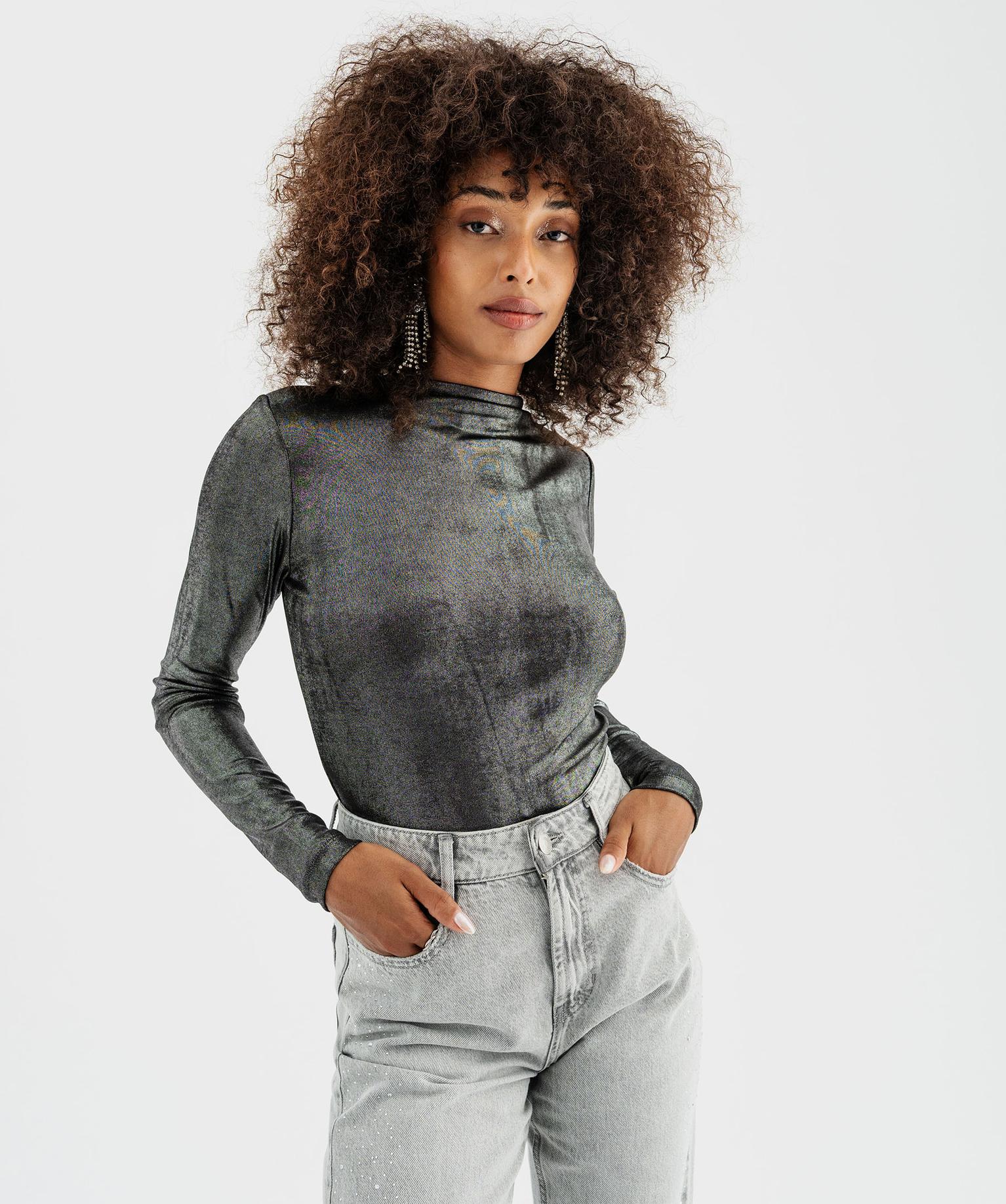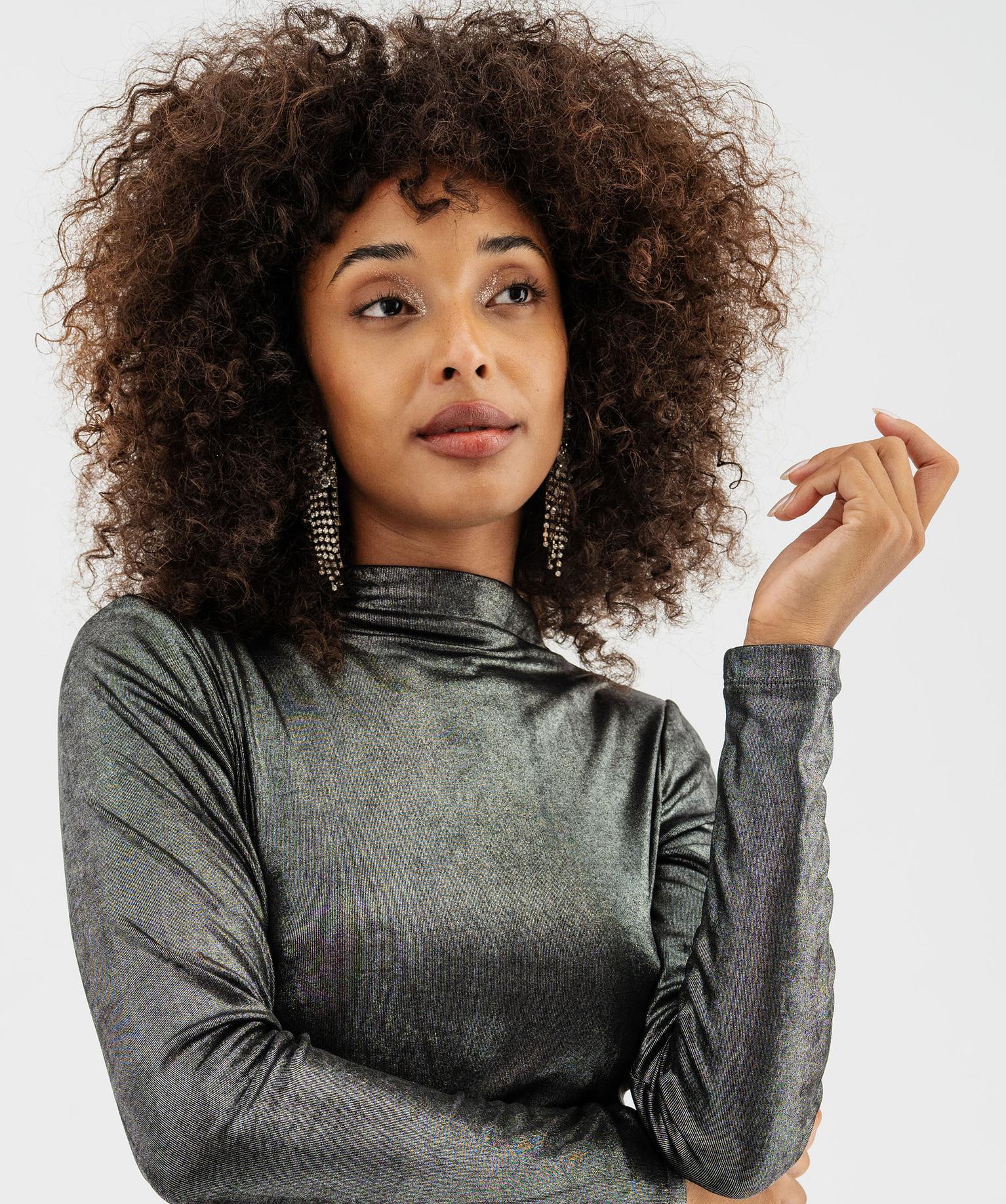 Cet élégant tee-shirt à manches longues vous permettra de briller de mille feux ! Confectionné dans une maille souple aux reflets métallisés, il scintille et illumine les looks le jour comme le soir. Ce tee-shirt femme affiche une coupe ajustée et un petit col montant légèrement drapé qui saura mettre le port de tête en valeur. Pour un effet encore plus glamour, n’hésitez pas à le porter avec une superposition de colliers !