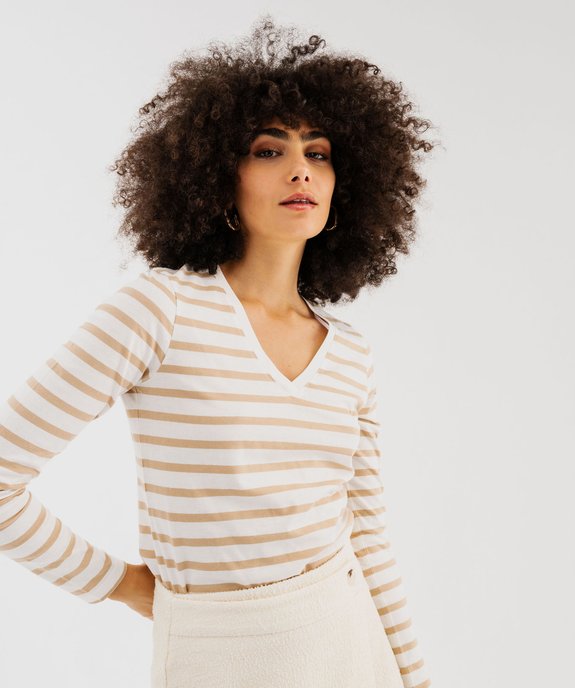 Ce joli tee-shirt rayé trouvera sa place dans votre dressing aux côtés de vos basiques. Un tee-shirt à manches longues et col V qui sublime la silhouette en toute simplicité et accompagne tous les bas unis. Un tee-shirt femme confectionné en coton offrant douceur et confort au quotidien. Décliné dans des couleurs tendre, il revisite avec modernité l’esprit marin et s’affirme comme une pièce phare à adopter cette saison !