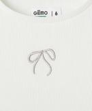 Ce tee-shirt à manches longues insuffle une touche de romantisme dans la garde-robe des filles. Confectionné en maille côtelée, il séduit par ses finitions froncées aux poignets et dans le bas. Ce tee-shirt fille est orné d’un délicat nœud brodé sur la poitrine, détail raffiné qui fait tout son charme. Un modèle confortable et élégant, à associer aussi bien avec une jupe pour une allure sage et chic qu’avec un jean pour un look plus décontracté.