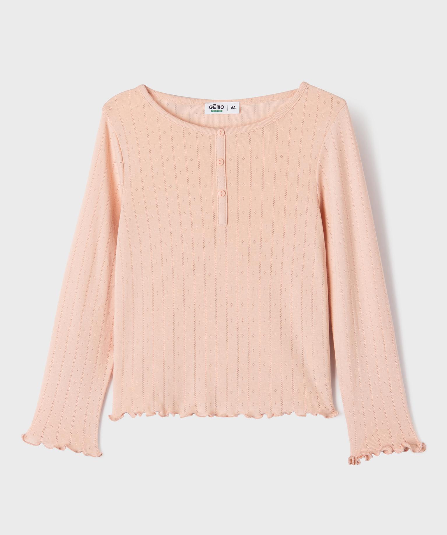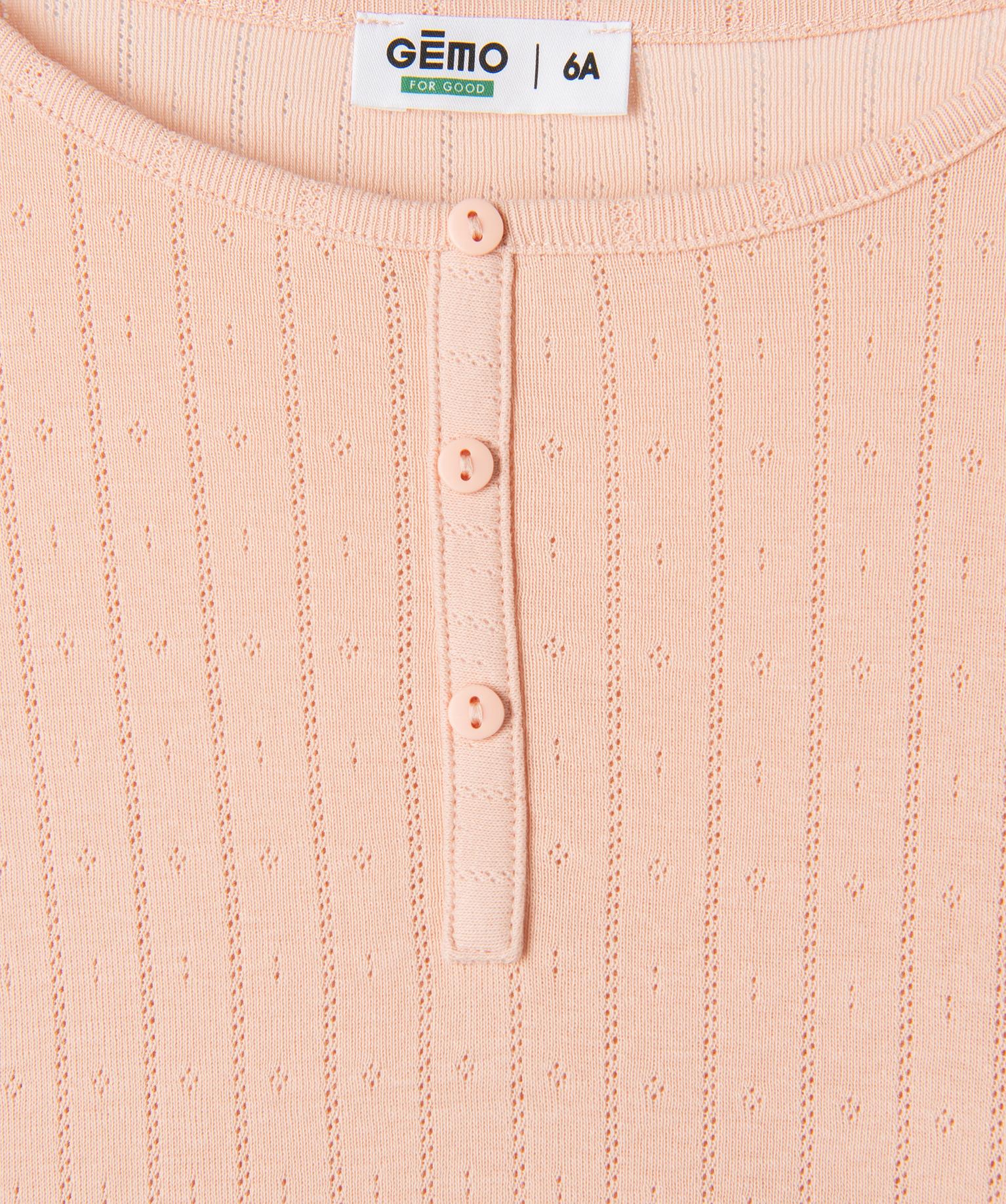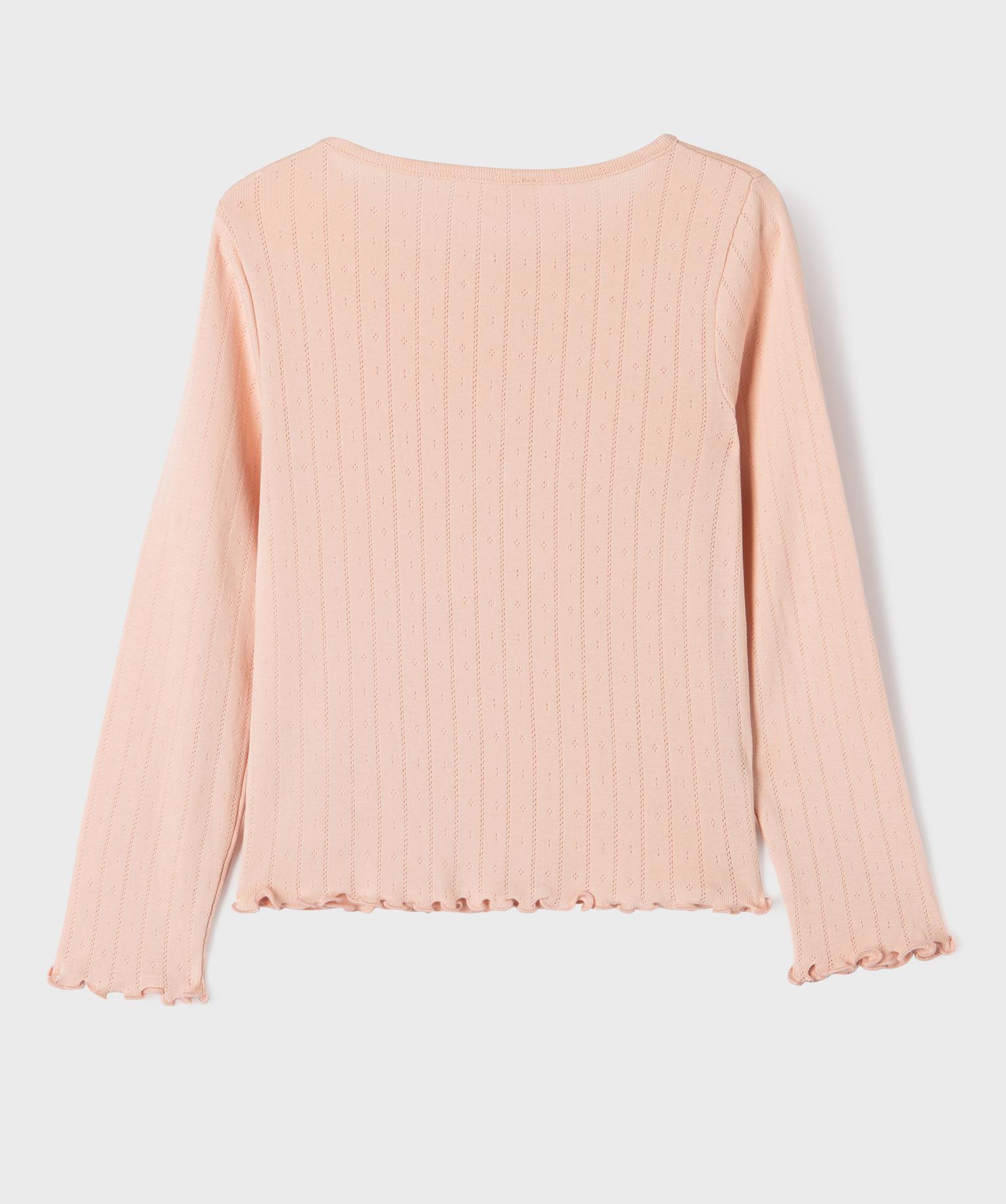 Ce tee-shirt à manches longues ajoutera une indéniable touche de romantisme aux tenues des filles avec sa maille fantaisie et ses jolies finitions froncées aux poignets et dans le bas. Un tee-shirt fille doté d’un col rond souligné par un biais, agrémenté d’une patte ornée de trois boutons fantaisie. Un modèle subtilement transparent à porter avec une jupe à volants ou avec un pantalon en coton.