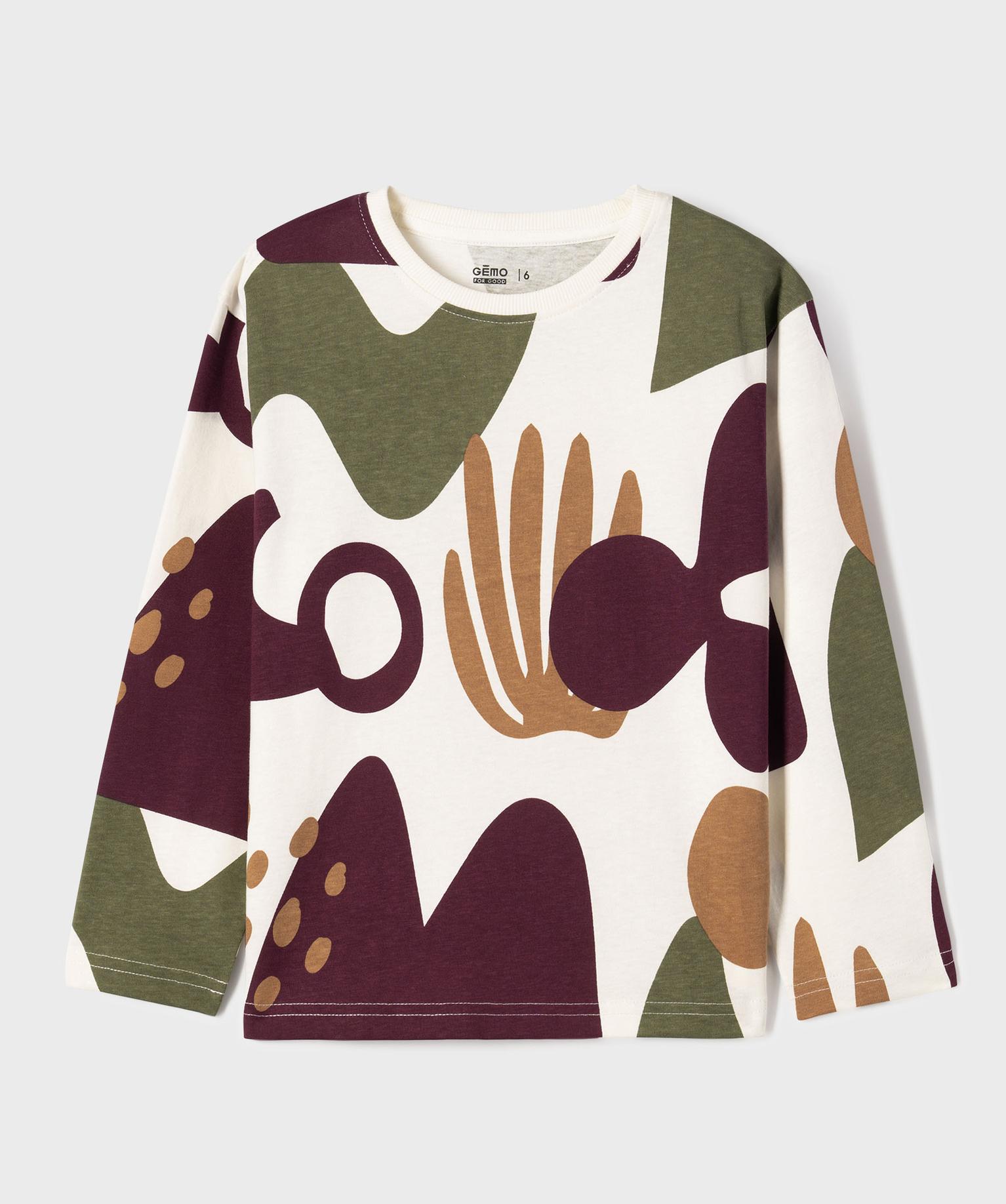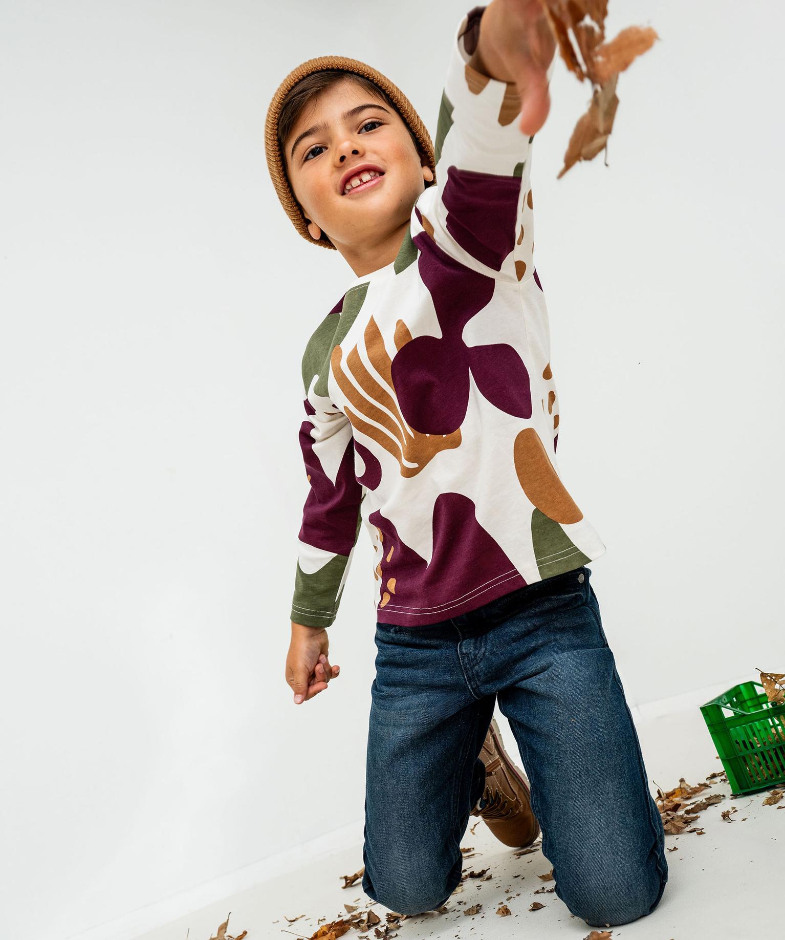 Ce tee-shirt à manches longues va booster les looks des enfants avec ses motifs multicolores. Un tee-shirt garçon avec col rond souligné par un bord-côte, confectionné en coton et coton recyclé. Il apportera une note colorée dans la collection de basiques des enfants. Il se porte avec un pantalon chino et des derbies pour une allure élégante et dynamique, ou avec un jean large et des baskets pour un look streetwear coloré.