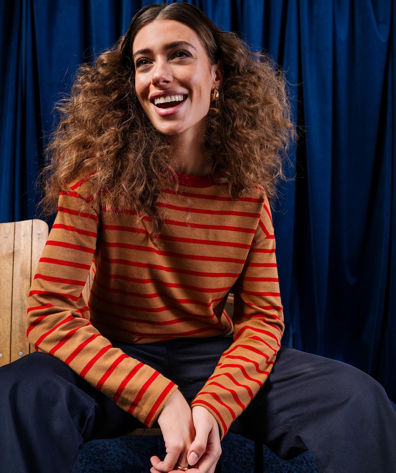Tee-shirt manches longues rayé en maille femme camel