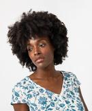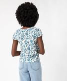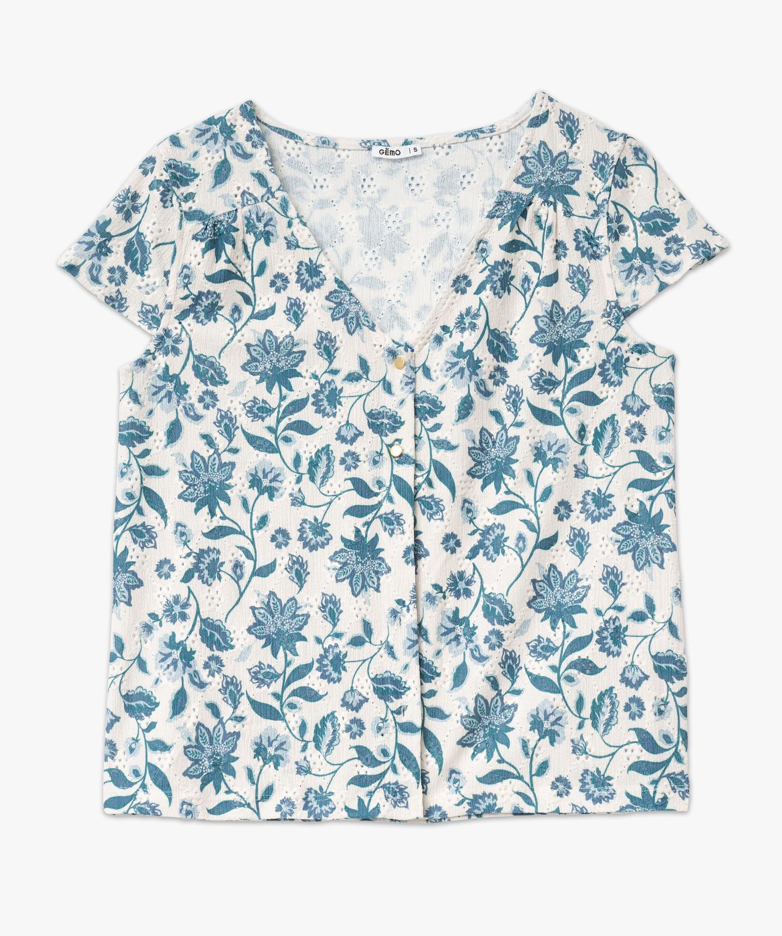 Ce ravissant tee-shirt femme imprimée joue la carte de l'élégance avec son motif fleuri, ses boutons dorés et sa confection ajourée. Le tee-shirt à manches ultra courtes est en effet fabriqué dans une maille froncée, parsemée de petits ajours, et extensible, pour le confort et la féminité. Le tee-shirt présente une coupe droite, un col V dégagé qui se poursuit par une boutonnière. Le devant des épaules est froncé.