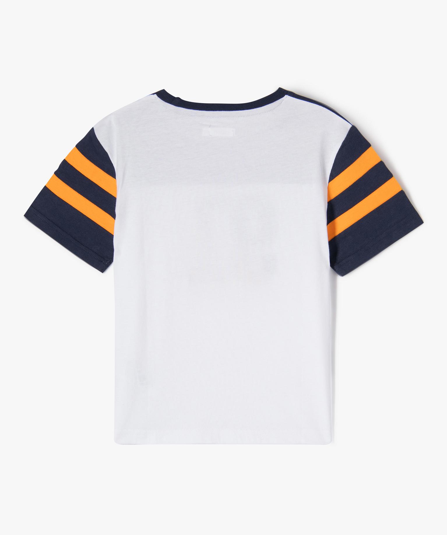 On aime ce haut au style sportswear qui apporte une bonne dose d'énergie au dressing des garçons ! Ce t-shirt à manches courtes se démarque par son grand motif chiffré en relief sur le devant, une touche ludique et texturée que les enfants adorent. Les manches sont également mises en valeur par des bandes contrastantes pour un effet graphique inspiré des tenues universitaires. Ce haut à la coupe droite est doté d'un col rond classique et s'enfile en un clin d'œil, idéal pour les matins pressés. Sa matière principale 100% coton assure un contact doux avec la peau tout au long de la journée.
