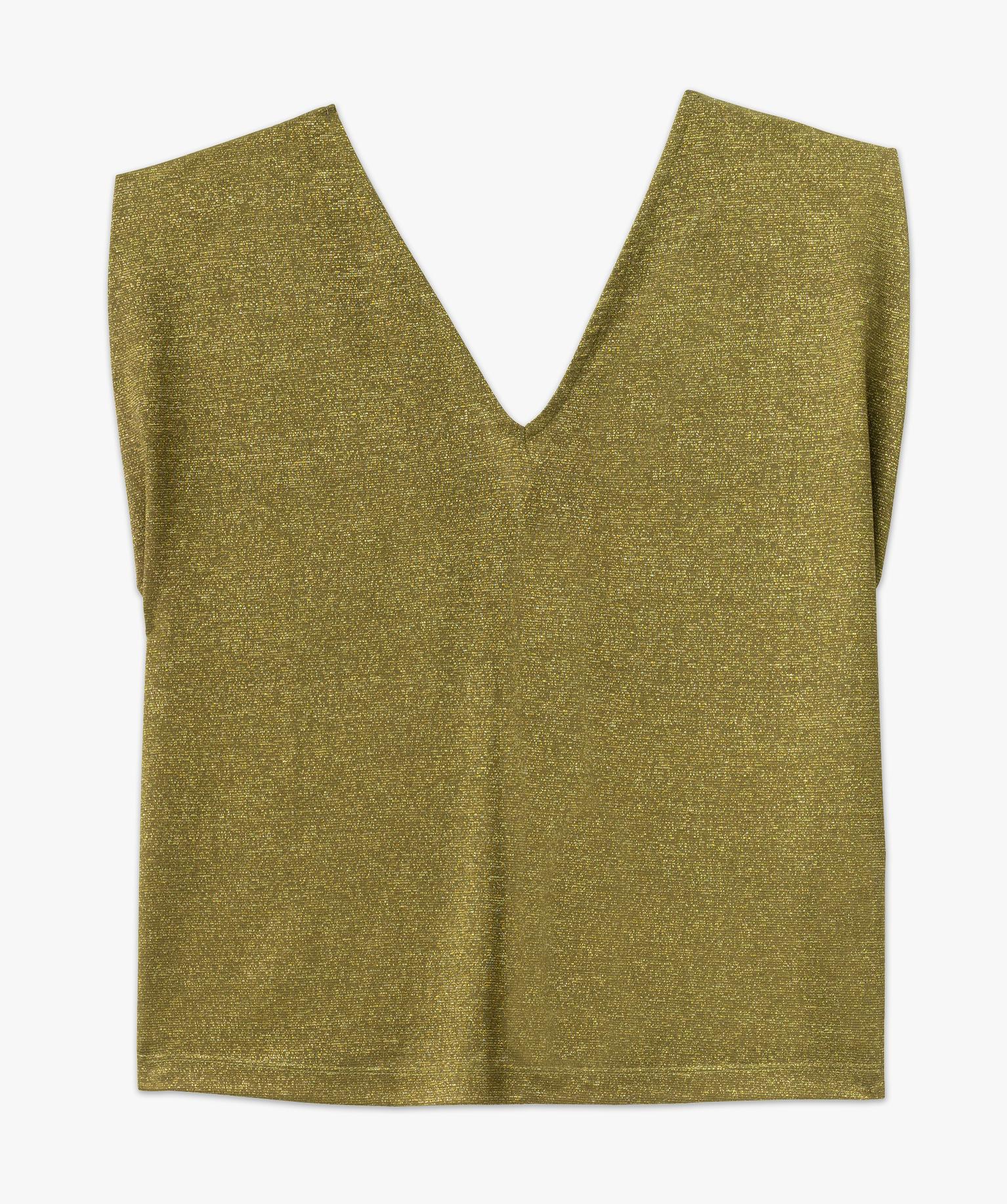 Ce tee-shirt sans manches ajoutera une touche d’éclat dans votre dressing et vous accompagnera lors de toutes vos soirées. Un tee-shirt femme confectionné dans une maille légère et extensible, incrustée de fil métallisé. Il possède un double col en V permettant de mettre en valeur le décolleté et le dos. Ce haut de soirée scintillant s’associe à un pantalon de costume ou une jupe crayon et des escarpins à talon.