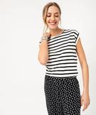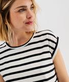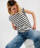 Pour une allure décontractée tout l’été, optez pour ce tee-shirt rayé en coton. Une coupe ample, des manches ultra courtes sans emmanchures mais avec des revers cousus, un large col rond en bord-côte, ce tee-shirt femme a tout pour vous assurer un look tendance. Un tee-shirt à manches courtes dont l'allure loose s’accordera parfaitement avec un pantalon slim ou avec un short en jean pour prolonger la saison estivale.