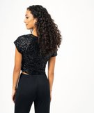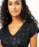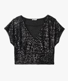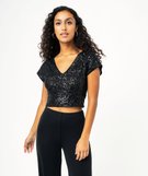 Osez le petit haut à sequins pour une tenue festive et sexy ! Avec sa coupe courte, ses emmanchures tombantes et son décolleté en V, ce crop top va mettre vos plus beaux atouts en valeur ! Pour un effet "wahou", vous le combinerez idéalement à une taille haute : jupe crayon ou pantalon de tailleur. Idéal pour vos tenues de soirée et looks de fête, ce tee-shirt sans manches femme se tente aussi avec un jean flare taille haute pour jouer le contraste avec son aspect glamour ! Large bande dans le bas pour accentuer l'effet blousant des emmanchures tombantes. Pinces sous poitrine pour le confort. Doublure tulle extensible.