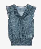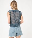 À mi-chemin entre la blouse et le tee-shirt sans manches, ce top fantaisie va égayer toutes vos tenues quotidiennes. Séduisant, il est confectionné dans une maille fleurie, extensible et translucide, qui laisse entrevoir la peau. Des volants habillent le profond col V et les épaules. De larges smocks marquent confortablement la taille en donnant au tee-shirt un petit côté blousant. Un tee-shirt à oser seul, avec un short en jean grunge et des espadrilles ou à porter de manière habillée sur un débardeur près du corps avec une jupe droite et des sandales à talon. Liens à nouer à l'encolure. Surpiqûres devant.