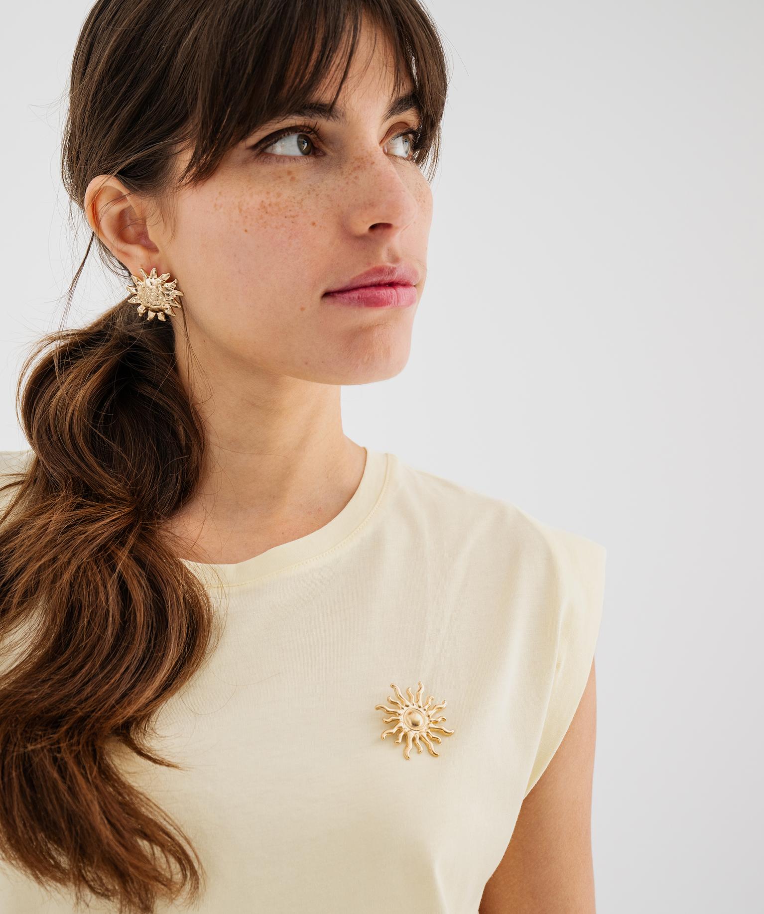 Ce tee-shirt sans manches en jersey de coton adopte une coupe loose très actuelle avec des épaules tombantes. Son allure minimaliste est sublimée par un détail précieux : une breloque soleil en métal doré fixée à la poitrine . Le basique revisité mélange confort et accessoirisation : il trouvera sans aucun doute sa place en haut de la pile des tee-shirts d'été ! Col rond en bord-côte. Dos uni. Ornement métallique riveté qui s'enlève pour le lavage. Mancherons rentrés : pas de coutures visibles en bas de manches.