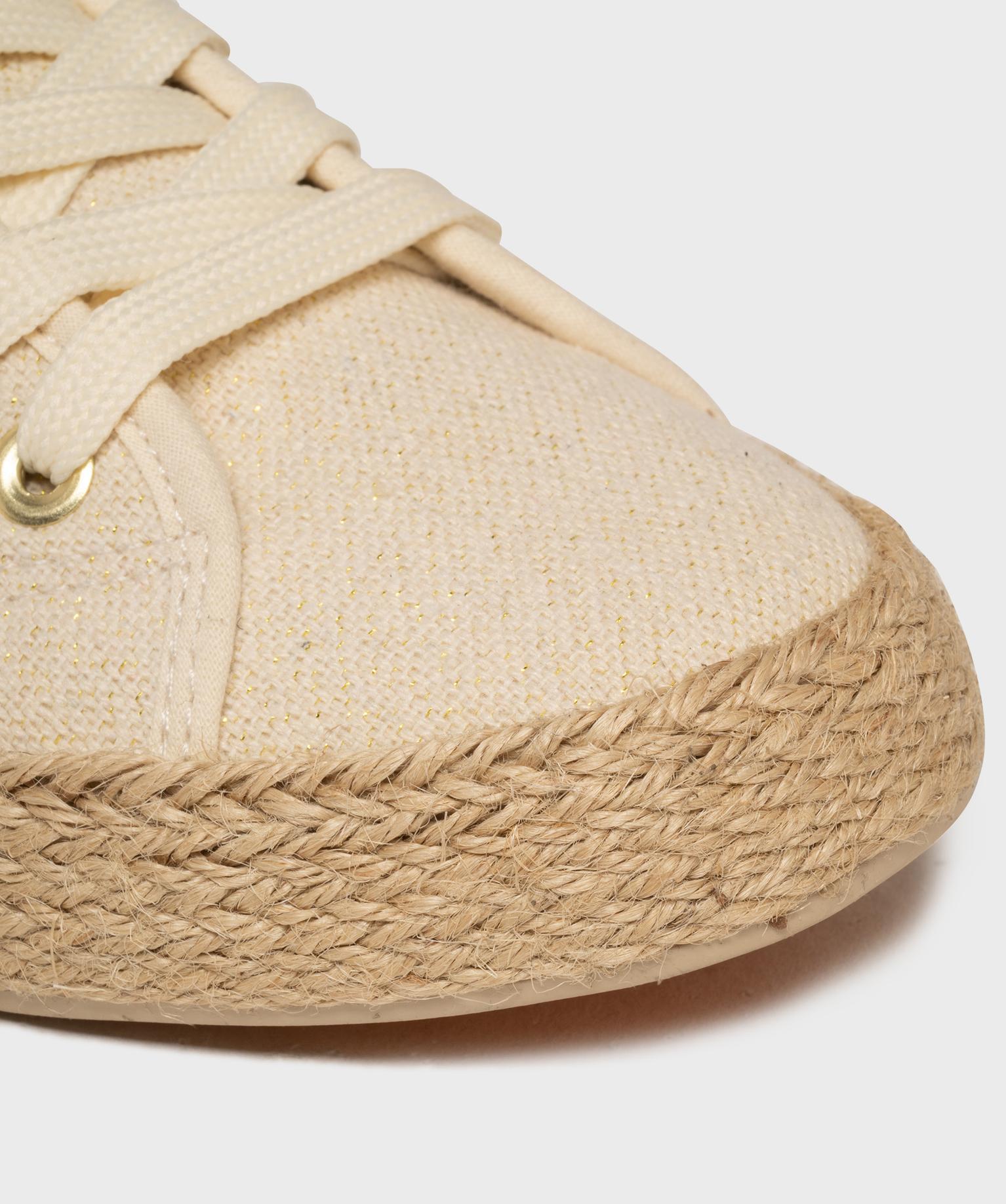 Esprit estival garanti avec ces tennis en toile au charme naturel. Leur toile texturée, légèrement pailletée, capte joliment la lumière et s’associe à une semelle corde inspiration espadrille. Les lacets plats à œillets métalliques et la petite tirette au contrefort ajoutent une note pratique et décontractée. Confectionnées avec une semelle intérieure moelleuse, les baskets femme accompagnent vos tenues d’été avec légèreté et style.