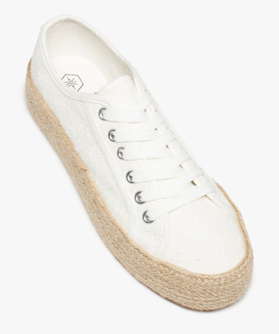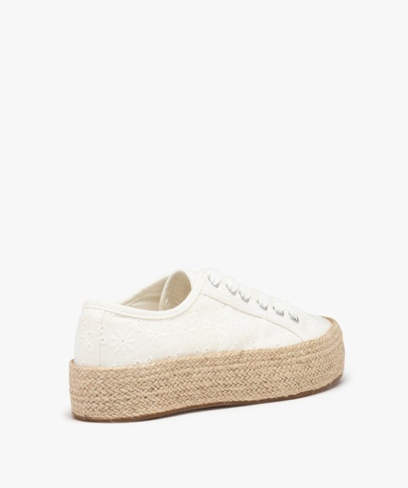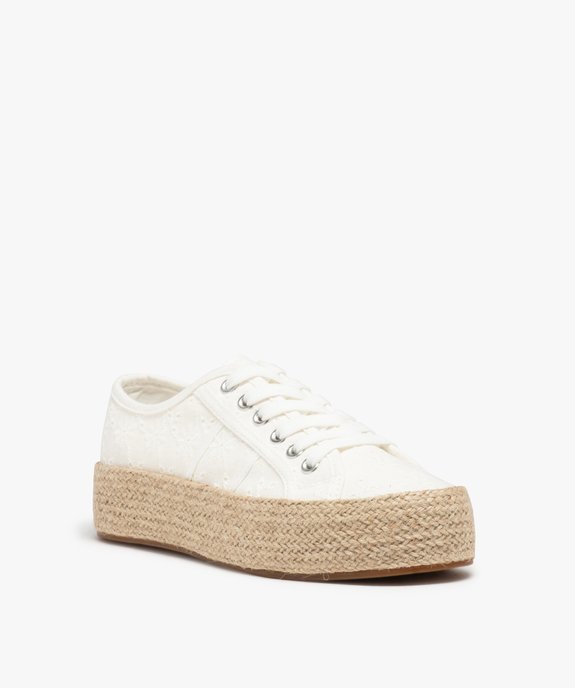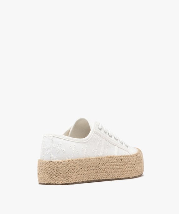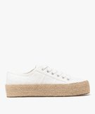 Une tige en dentelle anglaise unie, une semelle plateforme recouverte de cordelette tressée : ces baskets femme misent sur une belle inspiration bohème. Ce sont des tennis en toile résolument estivales, qui compléteront aussi bien une robe fluide qu’un jean retroussé. Un modèle incontournable pour la belle saison ! La semelle plateforme de 3 cm reste très confortable à la marche et tout en affinant subtilement la jambe. Fermeture lacets plats 6 œillets métalliques.