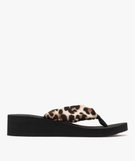 Les tongs pour femme se déclinent dans une version urbaine au top de la tendance ! Dès le premier coup d'œil, le talon compensé de 4 cm et les larges brides en toile imprimée léopard donnent le ton ! Des nu-pieds glamour, idéals pour peaufiner son style même à la plage ! À la ville comme à la plage, on les associe à l'ensemble du dressing pour un look 100% mode !