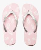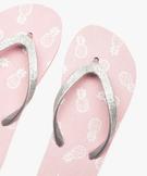 Tongs hyper girly en vue ! Chaussures idéales pour les vacances à la plage, les filles auront bien du mal à les quitter, tant elles sont stylées : entredoigt pailleté d'argent, semelle intérieure rose, motifs ananas tendance sur toute la semelle... on est fan !