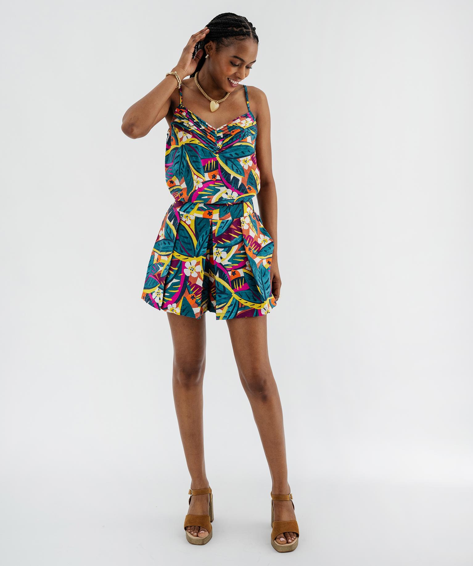 Ce sublime top à bretelles au coloris chatoyant ajoutera une note dynamique à toutes les tenues de l’été ! Ce débardeur femme, entièrement confectionné en viscose fluide, présente un aspect légèrement froissé et une encolure en V agrémentée de petits plis qui mettent le décolleté en valeur. Ce débardeur se porte tout au long de l’été en mode casual avec un short en jean, comme en version chic avec un pantalon fluide.