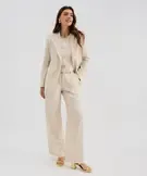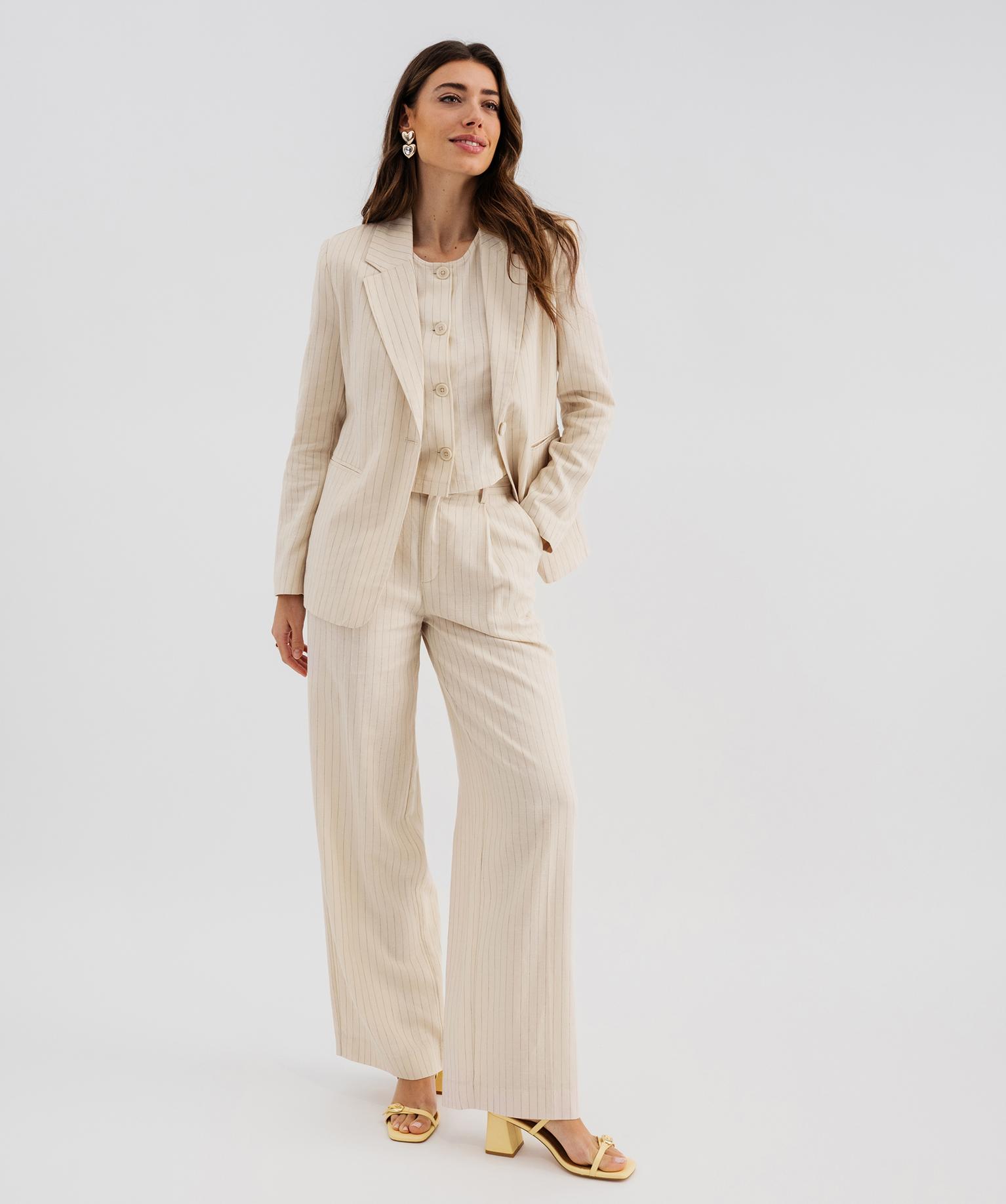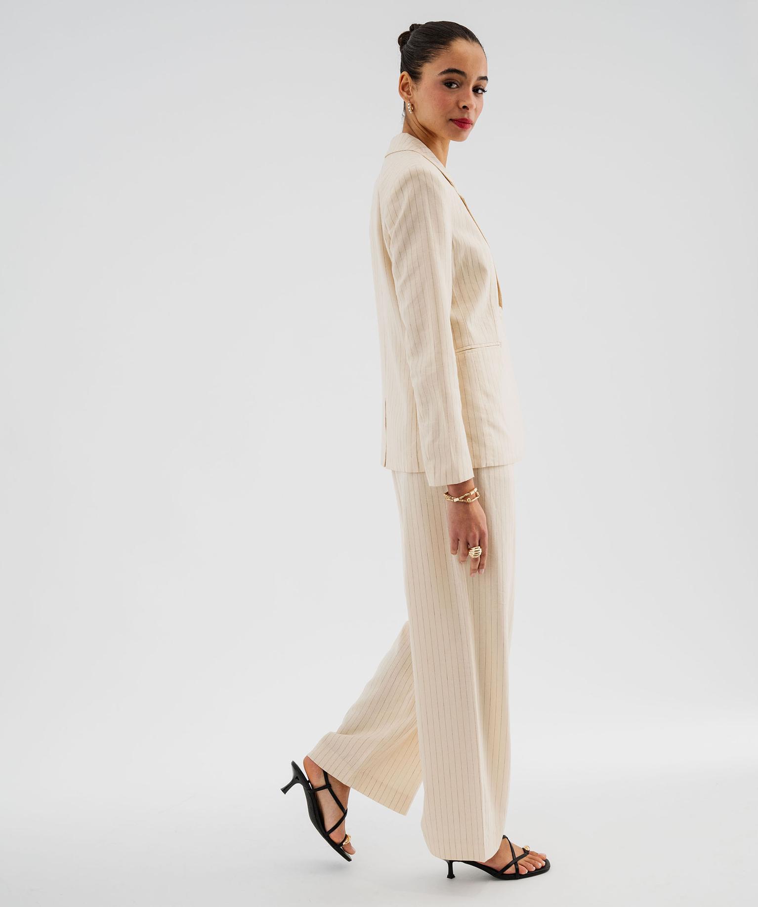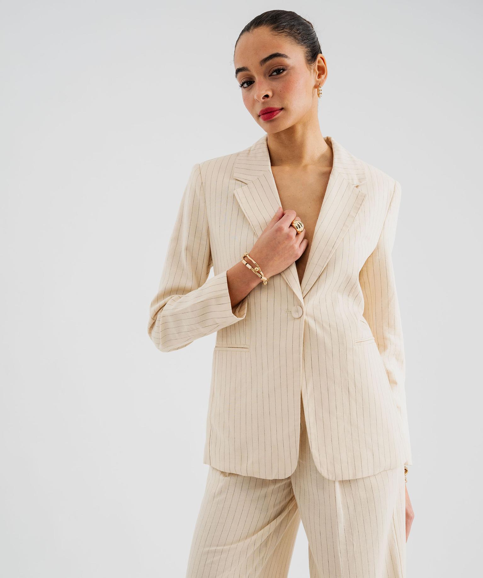 Ce blazer en viscose et lin séduit par son tombé élégant et son froissé naturel qui lui confère une allure authentique. Sa doublure intérieure satinée assure un confort impeccable au quotidien. La veste de tailleur reprend les codes du blazer classique : col tailleur, fermeture un bouton, coupe légèrement cintrée, poches passepoilées, fines épaulettes et fente au dos. On adore le bouton recouvert pour la finition soignée et ses fines rayures tennis chic et intemporelles. Une veste femme idéale pour apporter sophistication et légèreté à toutes les silhouettes.
