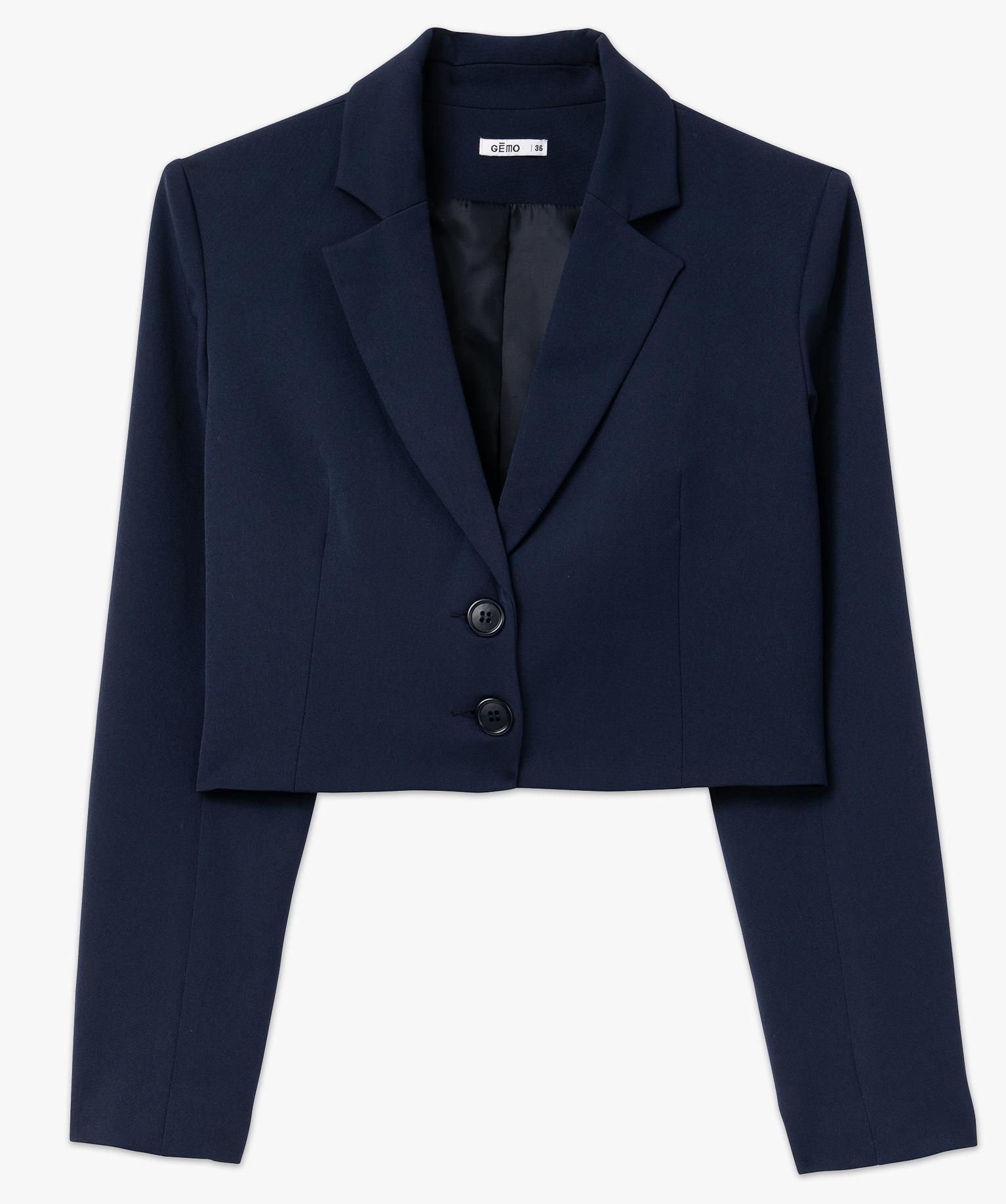Gémo réinvente les codes du blazer traditionnel et présente une version ultra courte pour coller à la tendance. Cette veste femme reprend tous les atouts d’une veste chic : grand col tailleur, pinces sur l’avant et au dos pour une coupe cintrée, doublure intégrale et fermeture deux boutons. Cette veste courte se porte avec un pantalon ample taille haute formant une tenue à la fois chic et contemporaine.