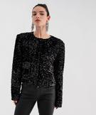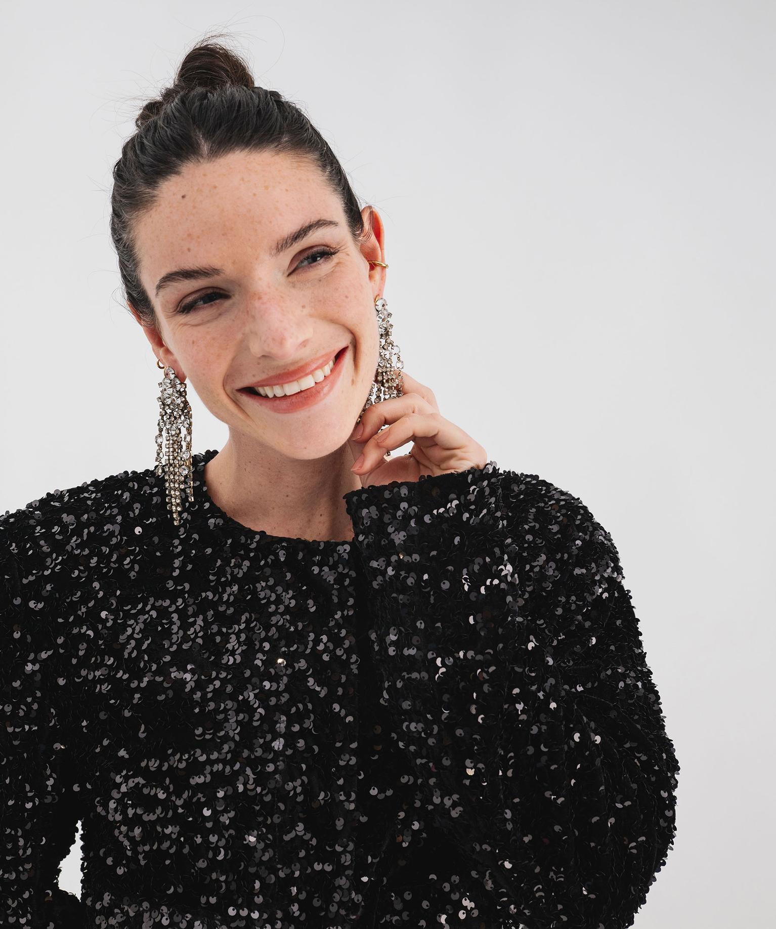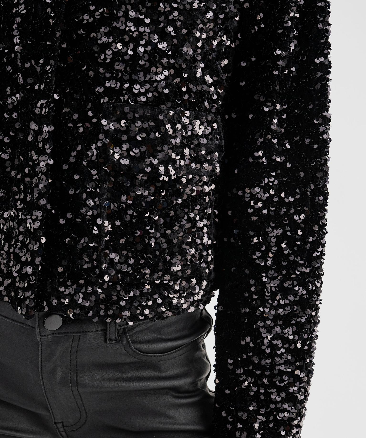 Cette veste courte en velours rebrodé de sequins brillants attire tous les regards avec son éclat sophistiqué. Véritable bijou de mode, elle mêle élégance originale et allure contemporaine. Son encolure ronde, sa doublure intégrale et sa fermeture par boutons-pression discrets en font une pièce aussi chic que confortable. La veste courte pour femme est équipée de deux poches plaquées à rabat pour une touche de modernité et de la praticité ! Une veste originale parfaite pour sublimer une tenue de soirée ou twister un look plus sobre avec audace.