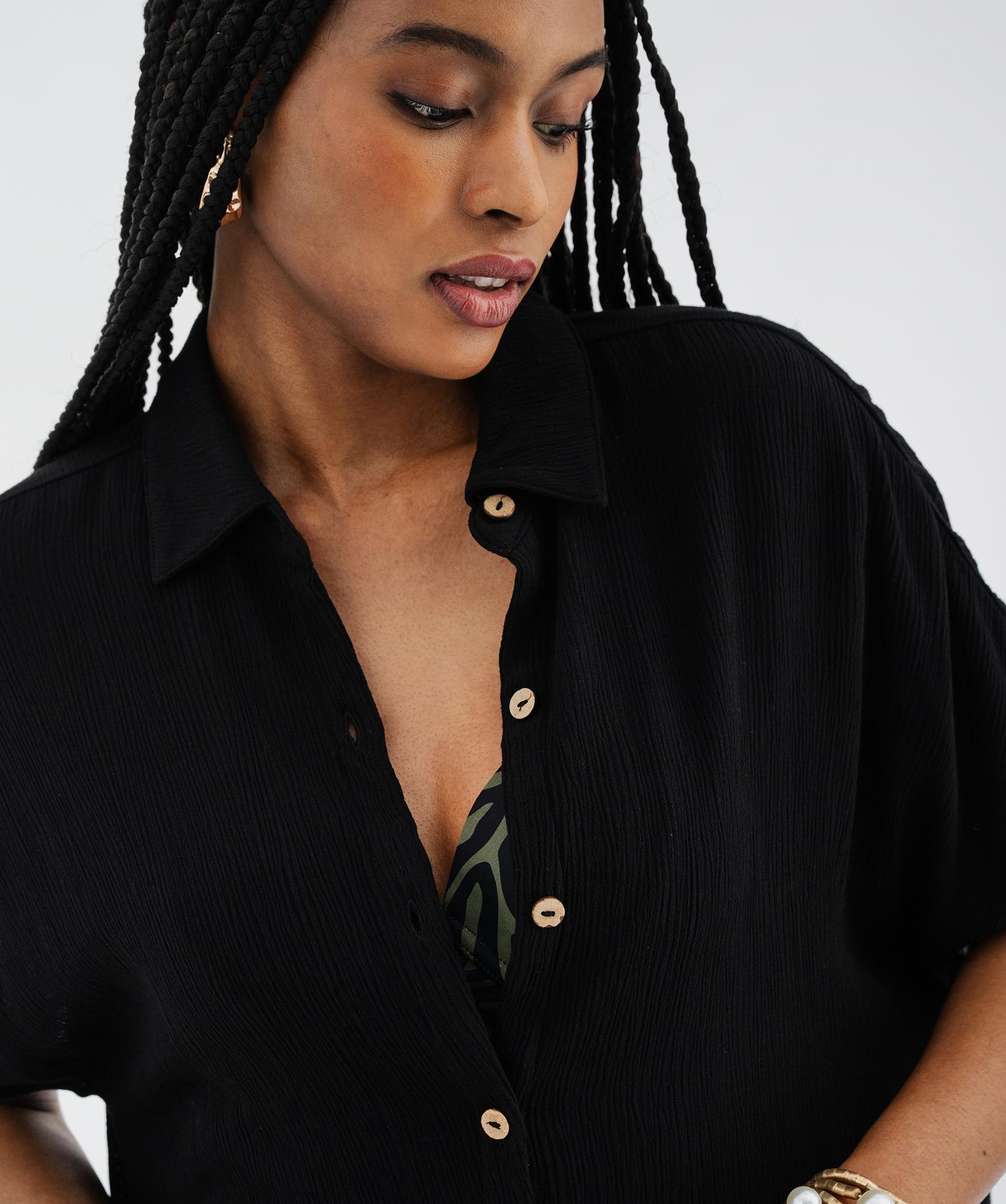 Cette veste de plage femme mi-longue se distingue par sa maille viscose fluide et délicatement froissée, idéale pour les journées ensoleillées. Son col chemise et sa boutonnière en bois imitation apportent une note naturelle à vos tenues de plage. La coupe loose, sans coutures aux emmanchures, offre un tomber souple et très confortable. La base arrondie et les fentes latérales ajoutent de l’aisance et renforcent son style décontracté. Une chemise longue parfaite à superposer sur un maillot ou en guise de tunique sur un short en jean.
