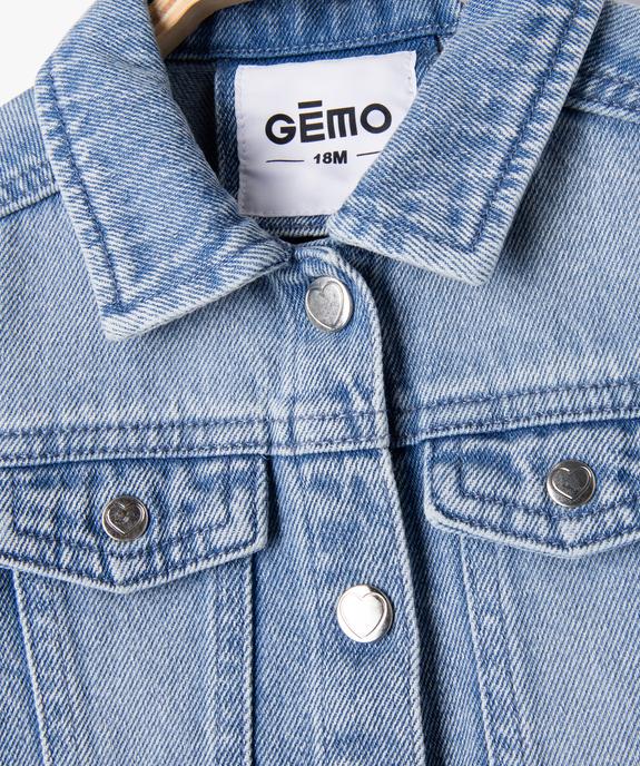 Gémo présente une veste en jean spécialement conçu pour les petites princesses. Elle affiche une coupe traditionnelle, des surpiqûres et relief et un petit col chemise, mais se distingue par des petits volants sur les épaules et des boutons pression avec coeur gravé. Une veste en denim bébé fille au coloris délavé qui ajoutera une touche de décontraction à toutes les tenues de la saison.