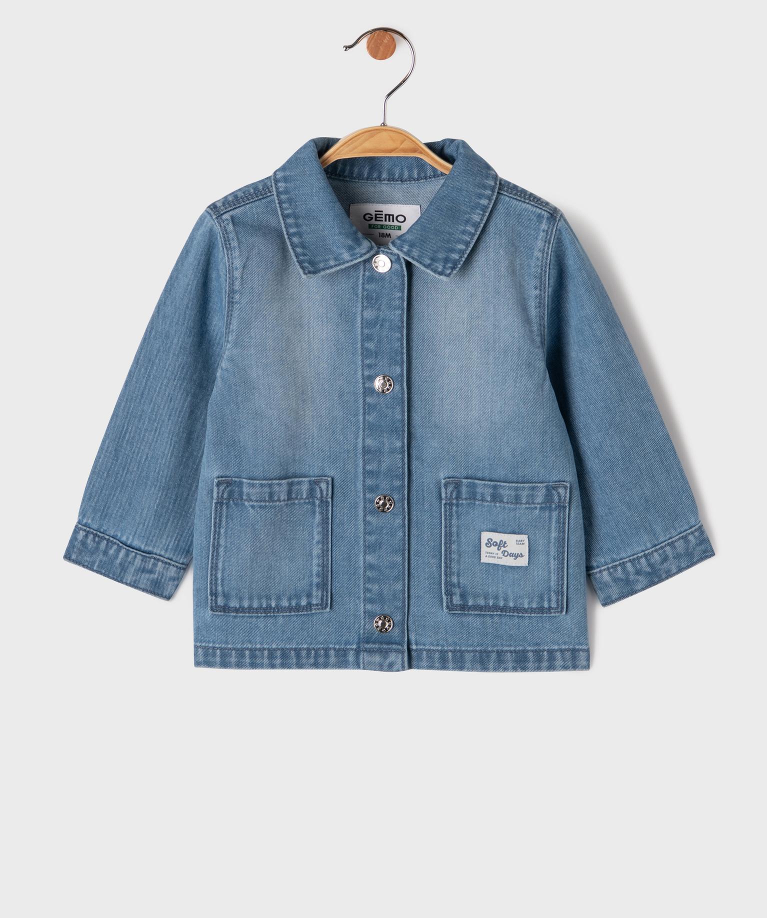Complétez les looks de votre fillette avec cette veste en jean casual et pratique. La veste bébé fille est fabriquée en denim 100% coton souple et joliment délavé. Vous apprécierez son design inspiré des vestes de travail : coupe droite et assez large, base droite, col chemise, 2 poches plaquées devant. Pensée pour faciliter le quotidien des enfants et de leurs parents, cette veste en jean est équipée de boutons-pression devant et aux poignets. Petite étiquette brodée sur une des poches.