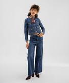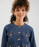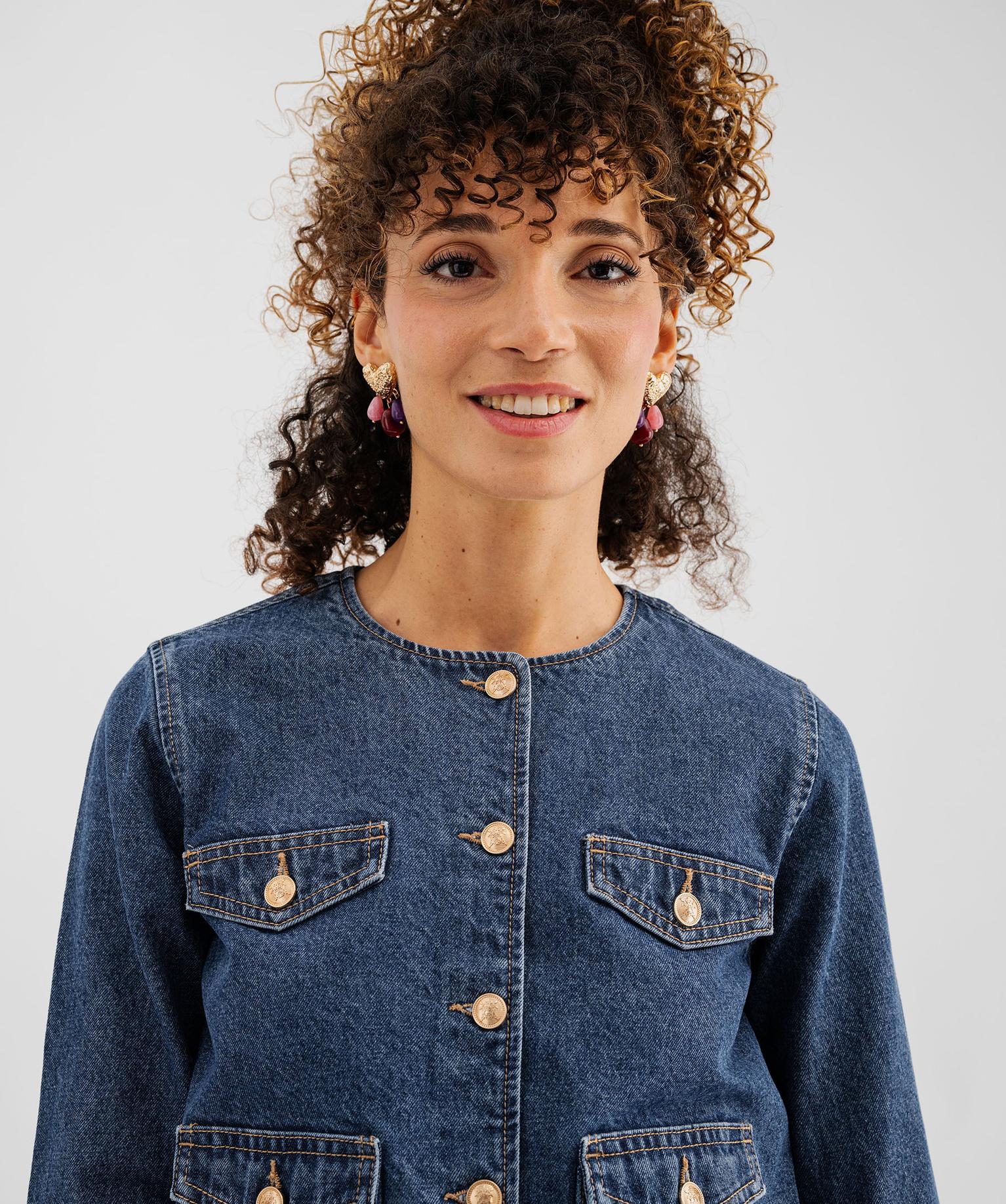 Apportez une touche de caractère à vos tenues avec cette veste en jean femme qui allie élégance couture et esprit décontracté. Sa coupe droite au-dessus des hanches met en valeur la silhouette. Le col rond apporte une note féminine et moderne. Les boutons dorés en métal gravé ajoutent de la sophistication à la veste, tout comme ses poches à rabat (2 vraies et 2 fausses, décoratives à la poitrine. Une veste à superposer sur un tee-shirt ou une blouse légère.