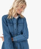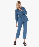 La veste en jean s’affiche cette saison dans une version plus longue et plus féminine. Une veste femme inspirée de la saharienne avec ses 4 poches à rabat, sa fermeture boutonnée et sa ceinture ton sur ton à nouer. Confectionnée dans une toile de coton fin, elle est très confortable. Cette veste longue se décline dans un coloris obtenu par un procédé de délavage plus économe en eau. On la porte avec un pantalon en lin et des sandales en corde.