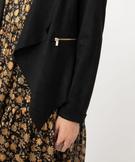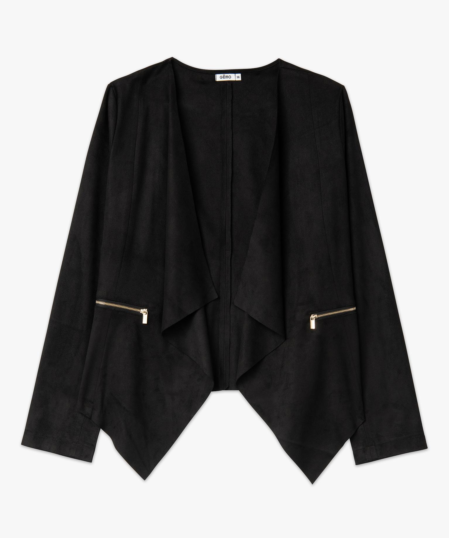 Une veste femme pleine de caractère : entre blazer et esprit biker, cette veste courte saura se faire remarquer par sa matière souple au toucher peau de pêche. Vous craquerez pour sa coupe asymétrique, son porté ouvert et ses zips dorés décoratifs. Cette veste en suédine se combinera parfaitement à une robe droite, une jupe patineuse ou encore une combinaison. Veste non doublée, finition bord-franc.