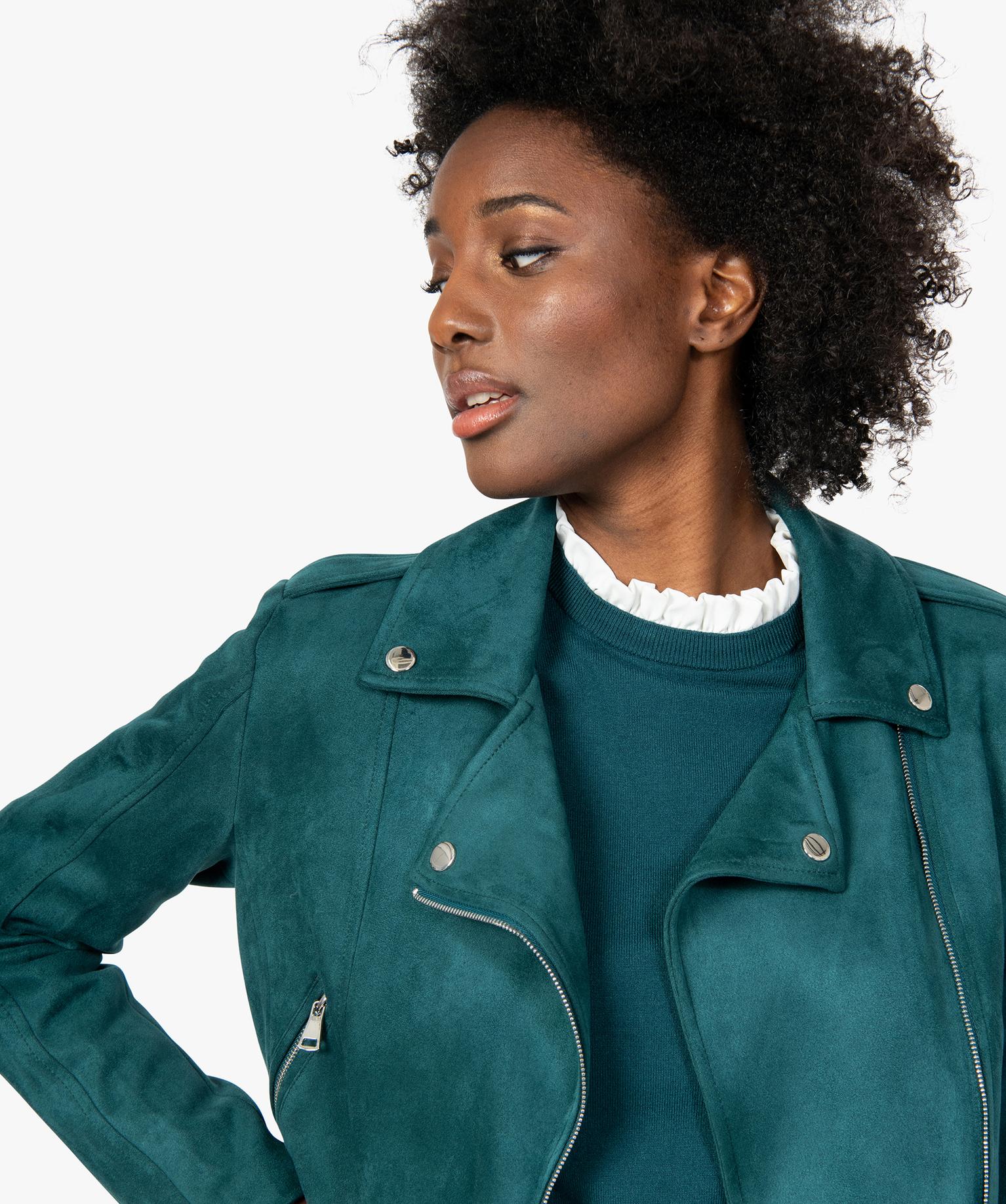 Une veste femme qui joue sur le mélange des styles avec son look rock inspiré du blouson biker et sa matière suédine ultra douce. Un blouson court avec fermetures zippées, boutons pression décoratifs et pattes pressionnées sur les épaules. Il affiche également de jolies surpiqûres qui lui donnent un effet cintré valorisant pour la silhouette. C’est la veste idéale pour twister une robe fleurie ! 2 poches zippées !