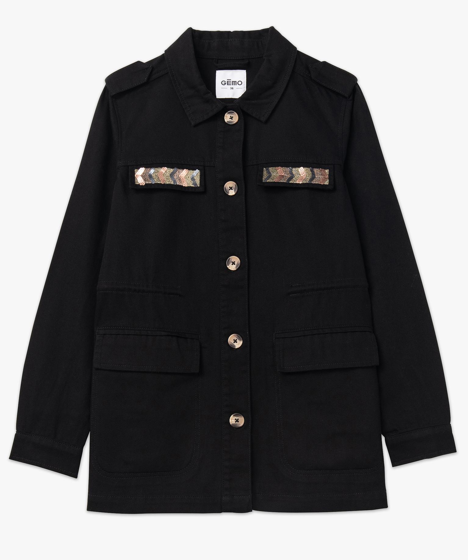 Veste femme saharienne avec broderies sur la poitrine noir