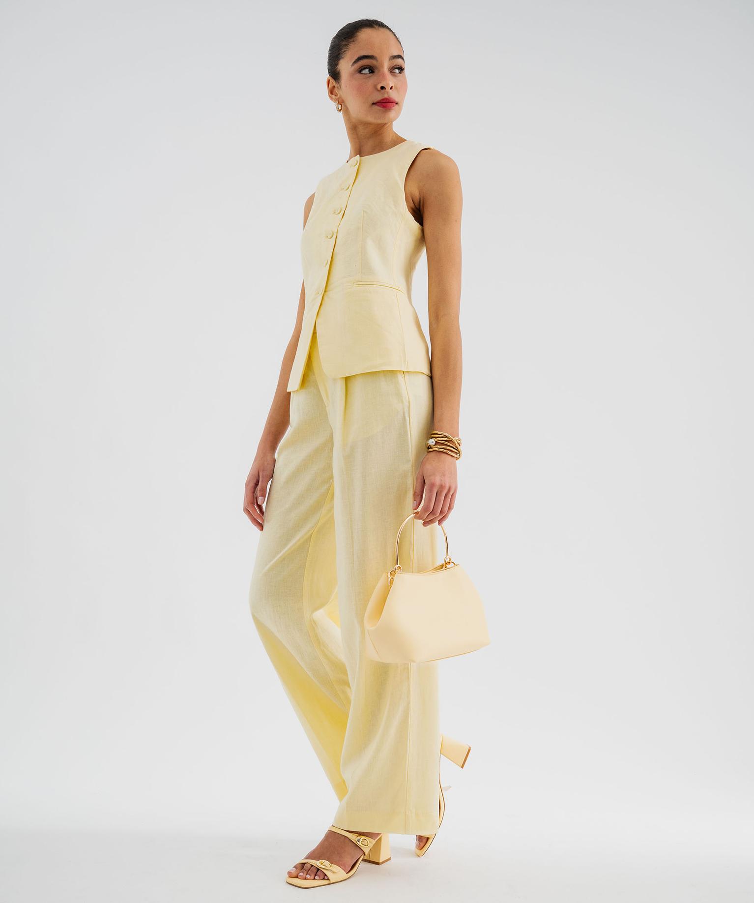 Ce gilet de costume pour femme en lin et viscose mêle structure et féminité. Sa coupe cintrée, son col rond et ses boutons recouverts lui donnent une allure raffinée. La veste sans manches est entièrement boutonnée jusqu'au cou et doublée d’un satin lisse qui glisse confortablement : elle se porte donc aussi bien sur une chemise, un body, un tee-shirt ou à même la peau, comme un top pour une allure séduisante. 2 poches passepoilées.