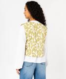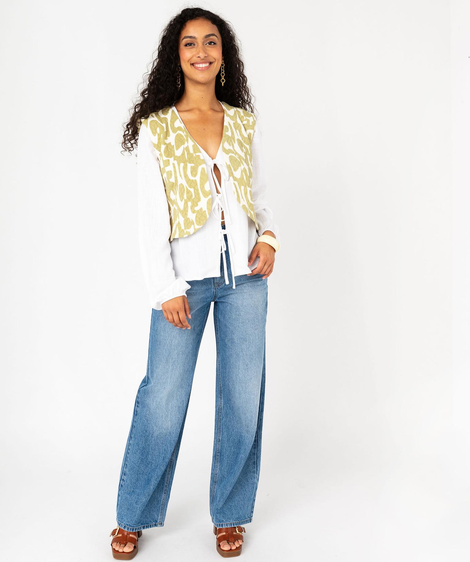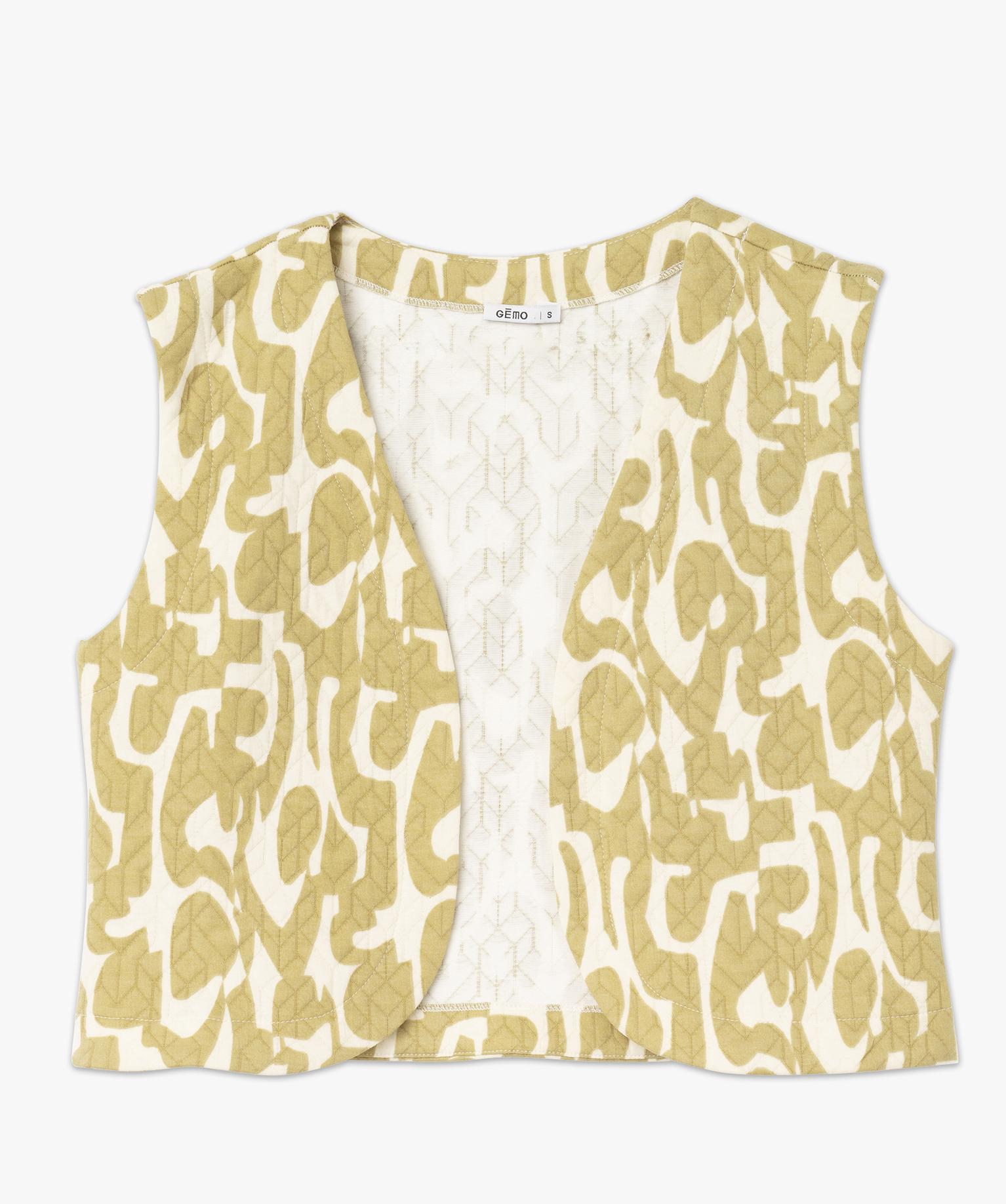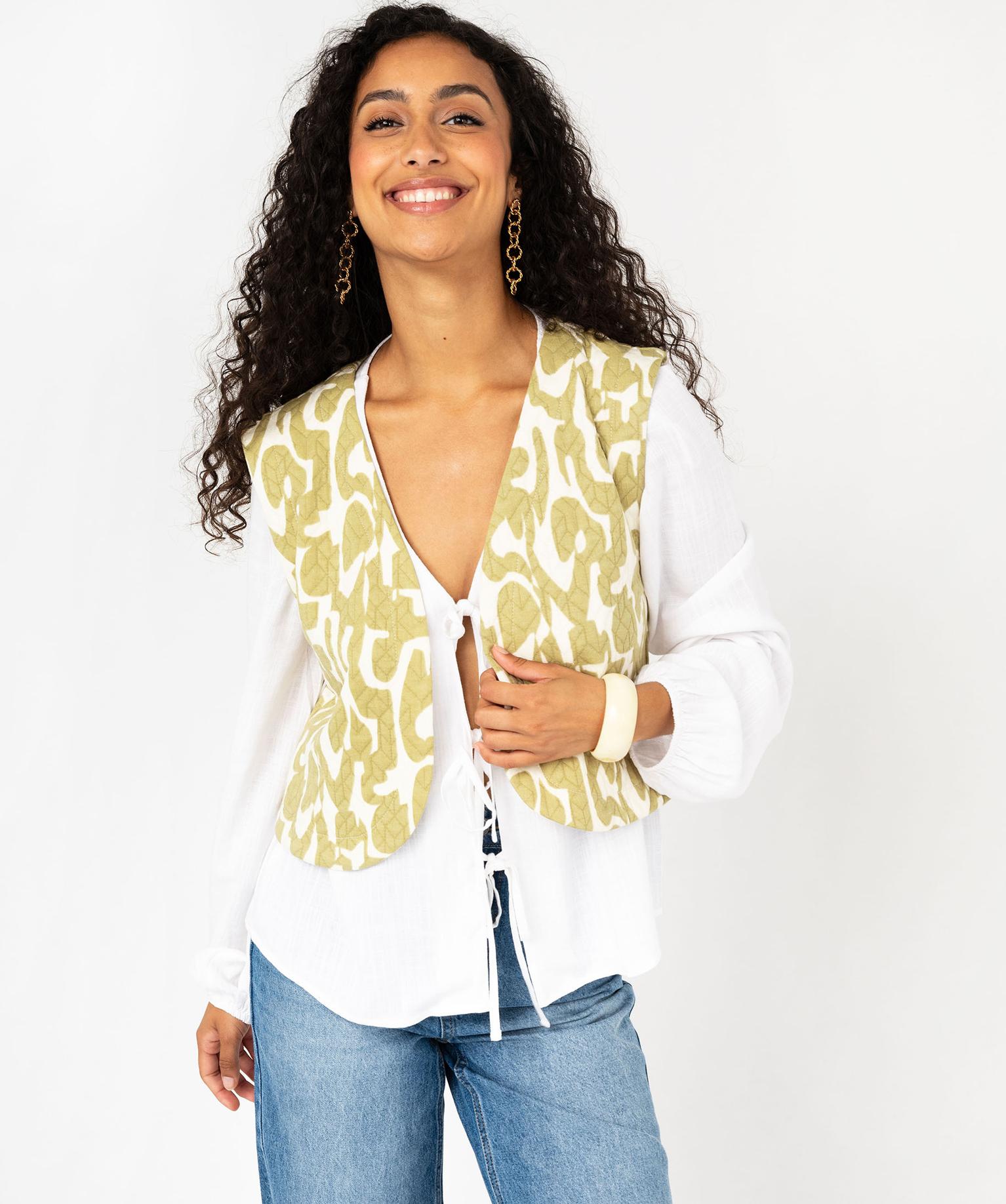 Cette petite veste femme est l'accessoire idéal pour réchauffer une robe, apporter un twist coloré à une blouse ou compléter une blouse bohème. Elle se présente comme un gilet sans manches et sans système de fermeture, avec les pans arrondis pour un joli tomber. La veste se distingue par sa coupe courte et sa confection en molleton imprimé, avec des motifs géométriques en relief dans la maille. Une pièce originale à tester avec tous ses hauts.