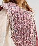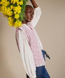 Cette veste sans manches femme matelassée revisite l’esprit bohème avec son magnifique imprimé fleuri façon motif indien. Sa coupe droite aux hanches, son col rond et son port ouvert lui donnent une allure décontractée. Le tout est sublimé par une doublure satinée rayée et un fin rembourrage qui ajoute juste ce qu’il faut de chaleur. Portée sur une robe fluide ou pour réveiller une tenue minimaliste, ce gilet apporte immédiatement style et caractère.